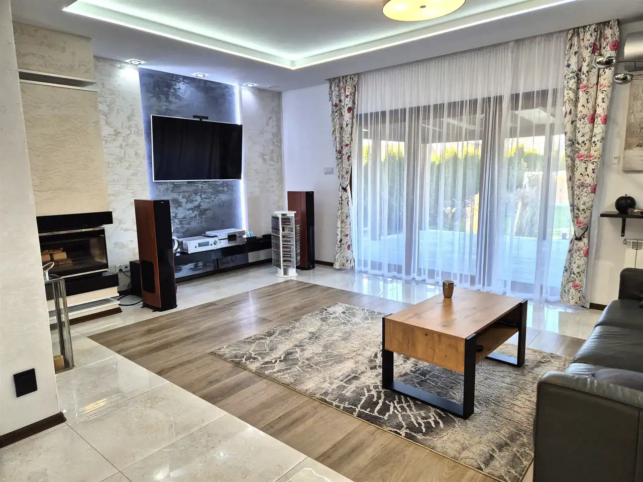w salonie znajduje się kominek (bez płaszcza wodnego), który stanowi dodatkowe źródło ciepła oraz tworzy przytulny nastrój – idealny na zimowe wieczory i spotkania rodzinne,