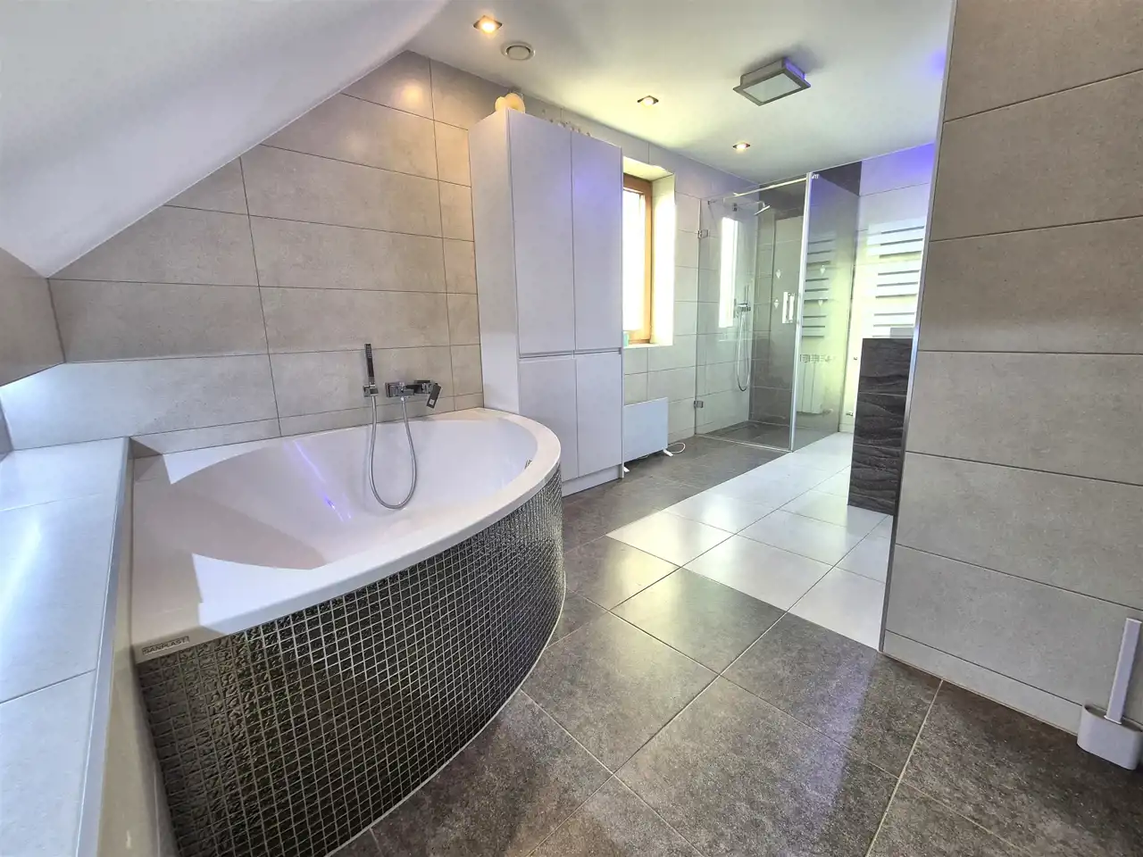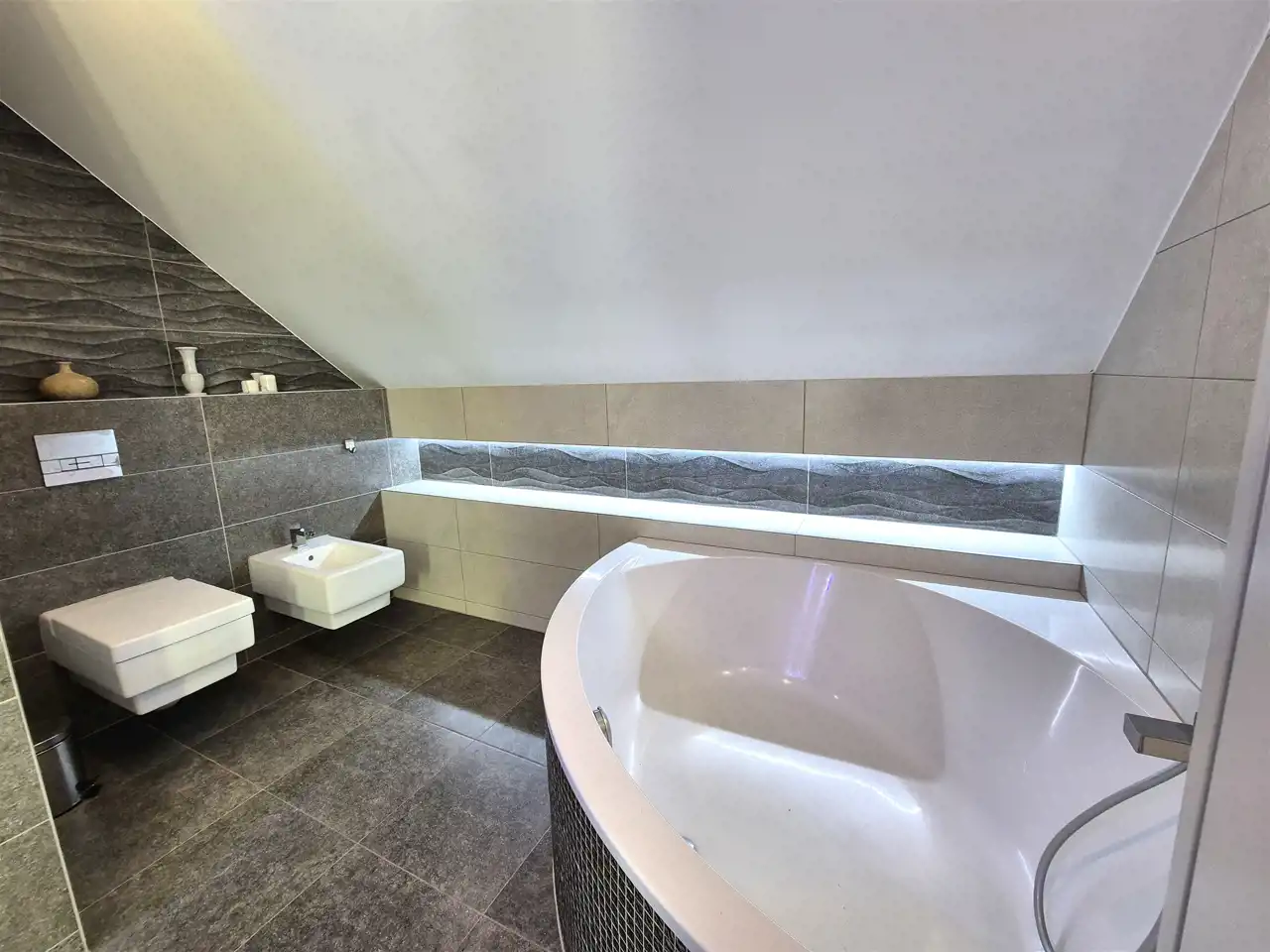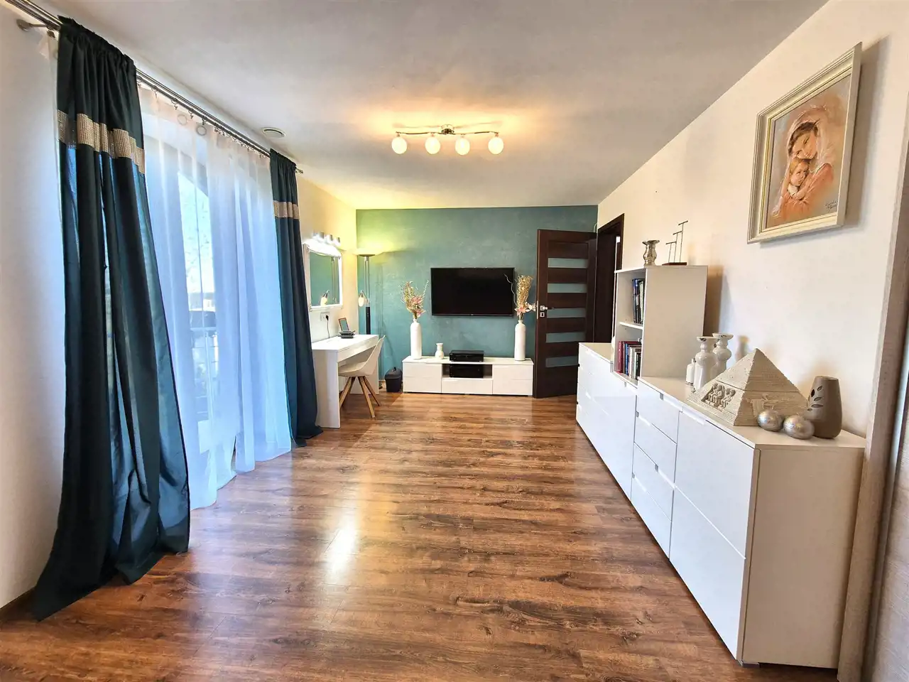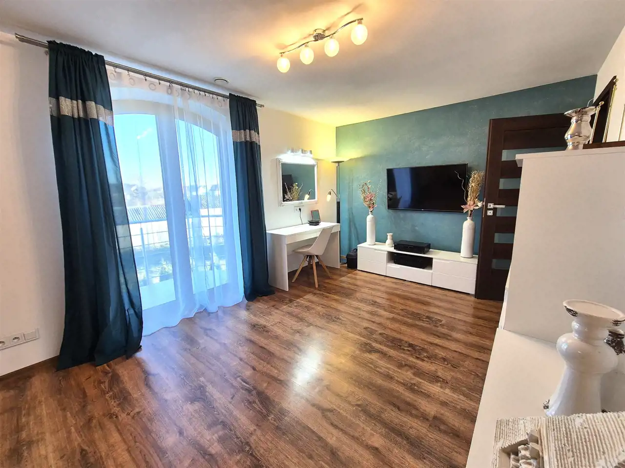 na podłogach wysokiej klasy panele oraz terakota,