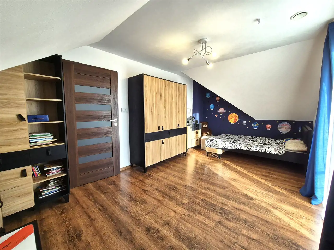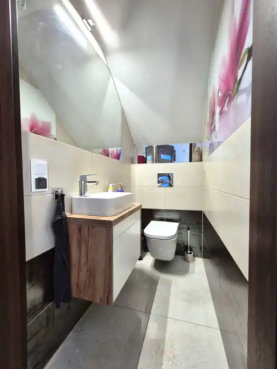 * na poddaszu zaaranżowano 3 sypialnie w tym jedną z garderobą, dużą łazienka z wanną oraz prysznicem, hall,