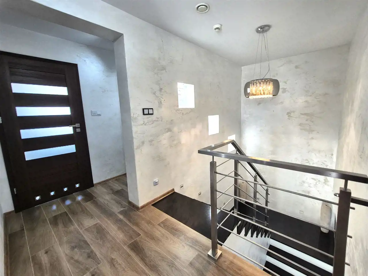 schody wykonane z granitu, zaś poręcze oraz barierki zewnętrzne ze stali nierdzewnej,