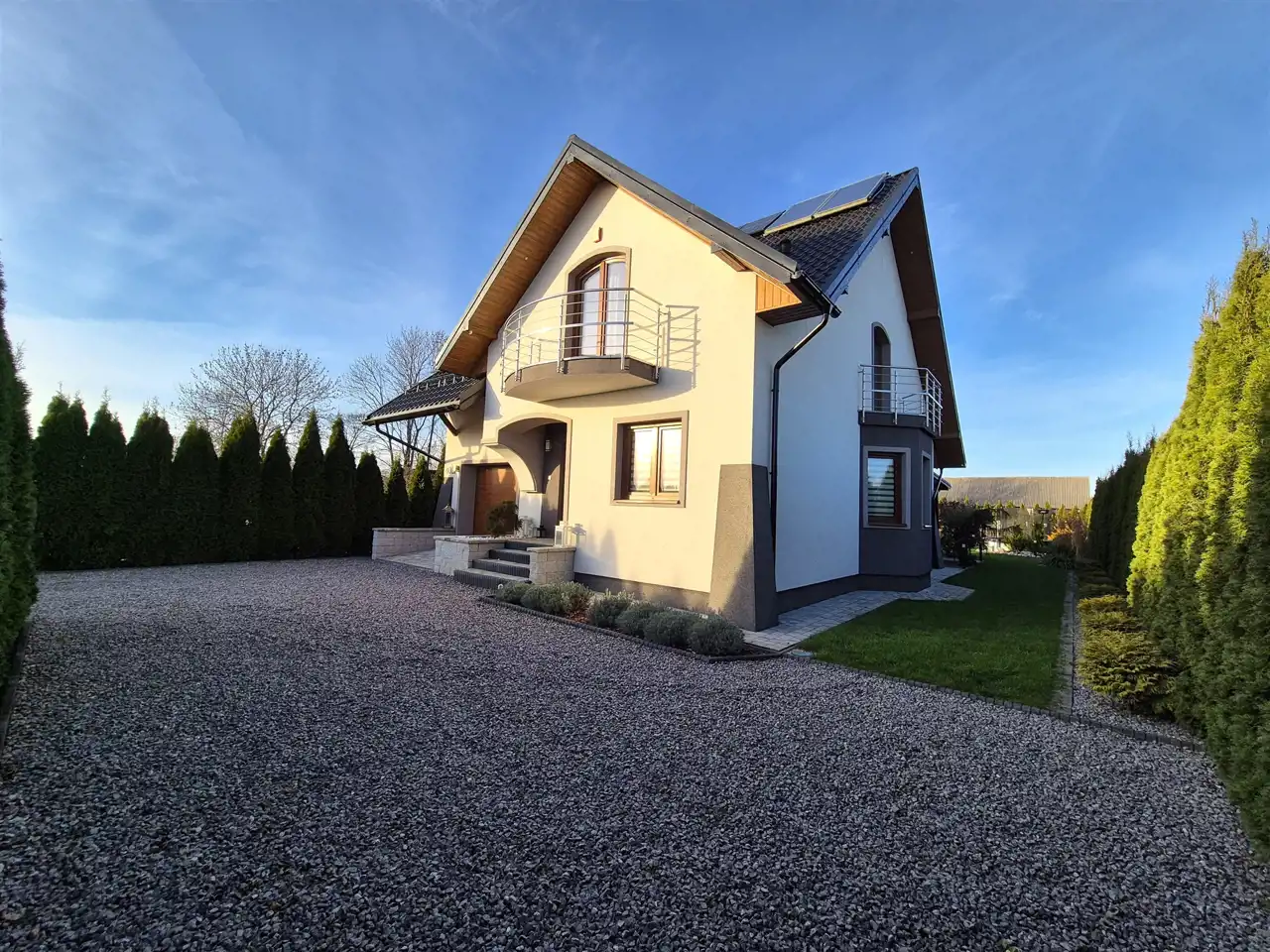 budynek wyposażony w kamery oraz system alarmowy, zapewniający maksymalne bezpieczeństwo i spokój domowników,