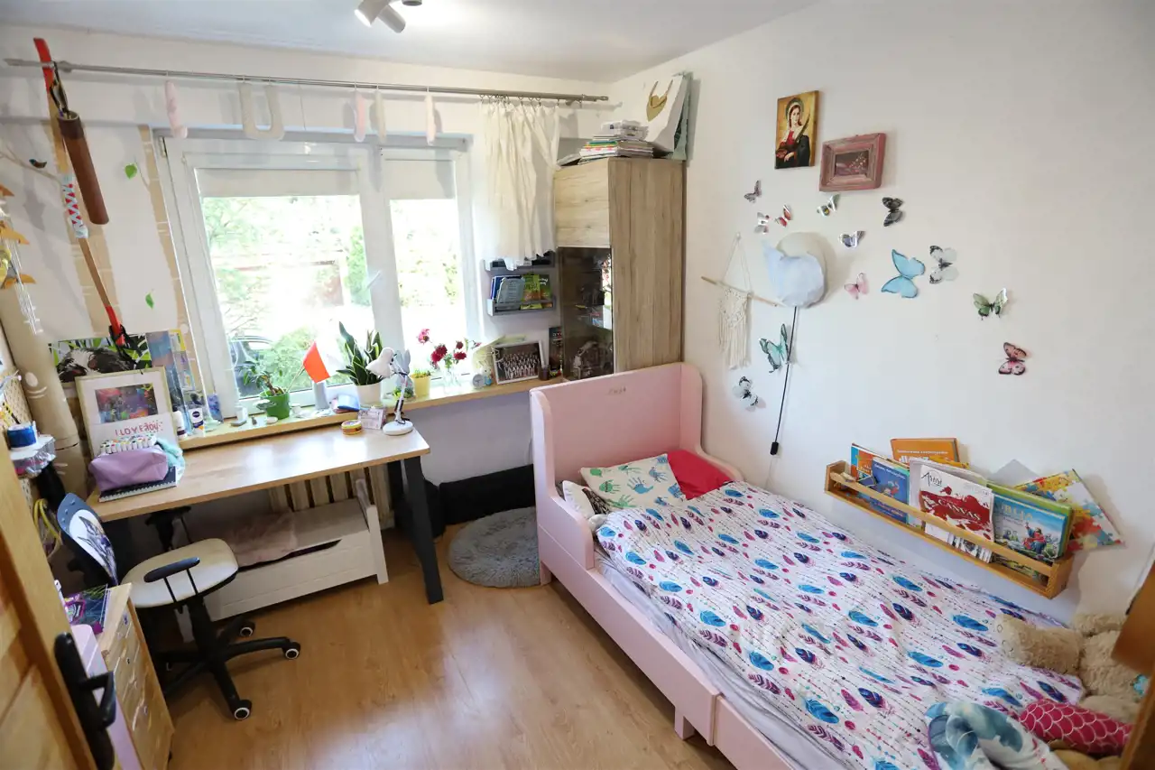 Mieszkanie składa się z trzech rozkładowych pokoi i jednego przejściowego, w tym z pokoju dziennego (16 m2) z wyjściem na balkon typu loggia (5 m2) od strony południowej, trzech sypialni (9/9/8 m2), oddzielnej i widnej kuchni (6 m2), łazienki z prysznicem (3 m2) oraz przedpokoju (6 m2). Mieszkanie wymaga odświeżenia.