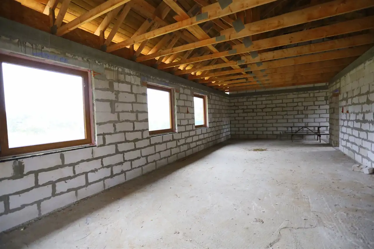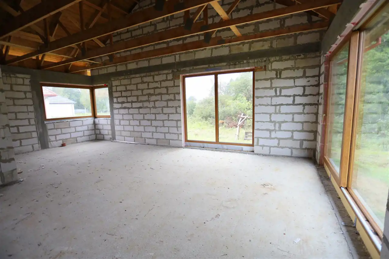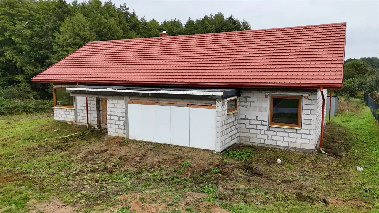 Budynek w trakcie budowy pobudowany z gazobetonu. Dach konstrukcji drewnianej (wiązary), deskowany, kryty grubą membraną i blacho-dachówką. Wykonano wszystkie obróbki blacharskie wraz z orynnowaniem oraz wykonano obróbkę kominów. Nad częścią garażową styro-papa grubości 15 cm.