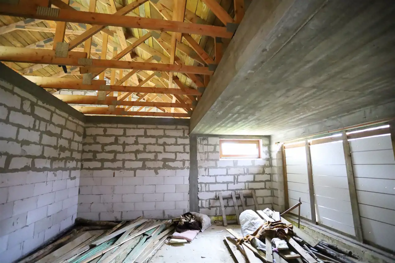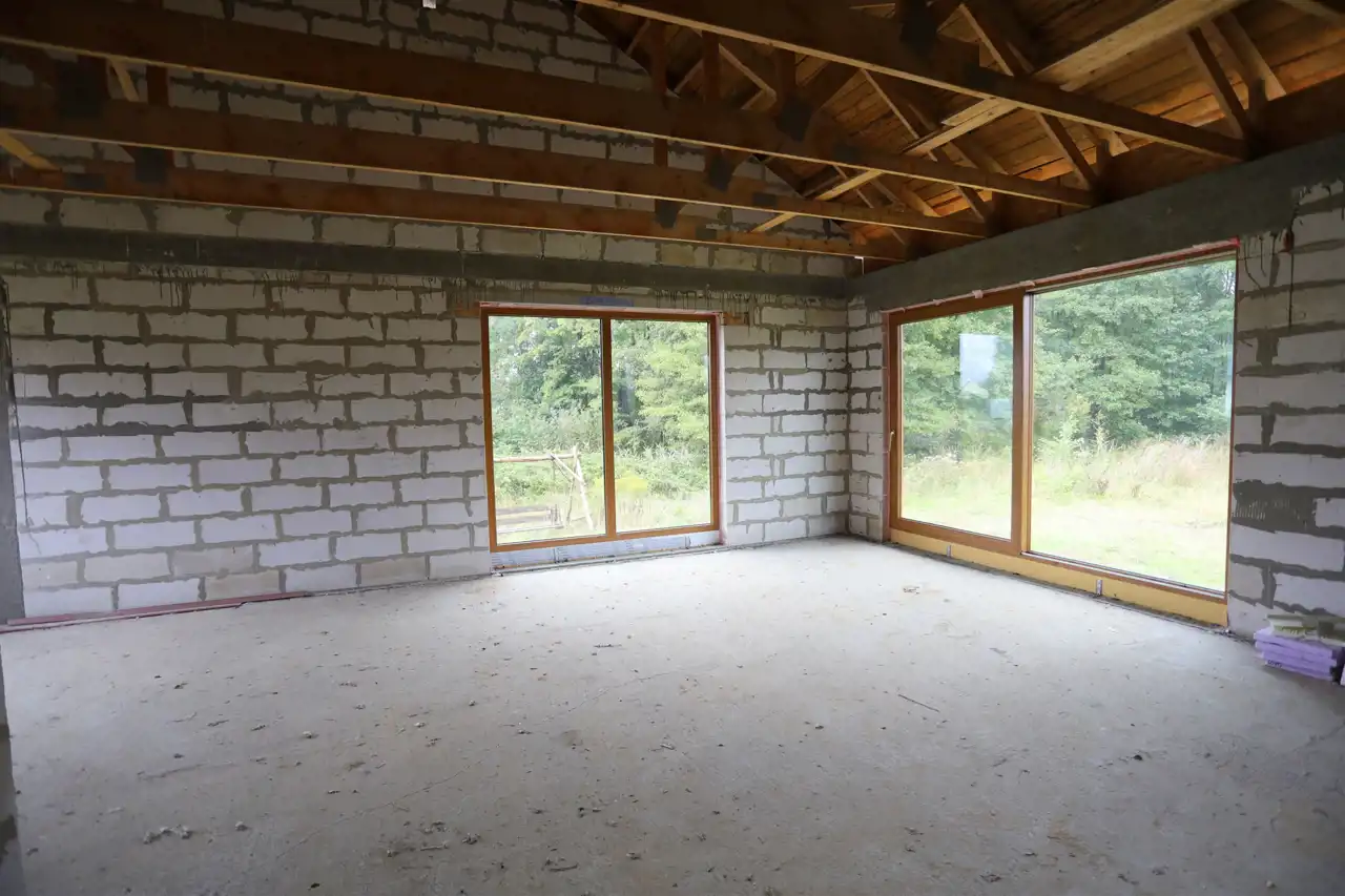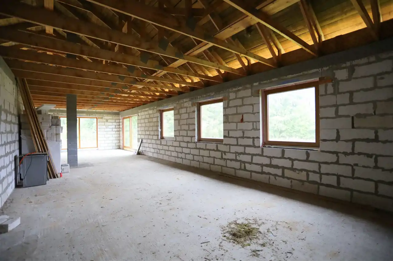 Budynek w trakcie budowy pobudowany z gazobetonu. Dach konstrukcji drewnianej (wiązary), deskowany, kryty grubą membraną i blacho-dachówką. Wykonano wszystkie obróbki blacharskie wraz z orynnowaniem oraz wykonano obróbkę kominów. Nad częścią garażową styro-papa grubości 15 cm.