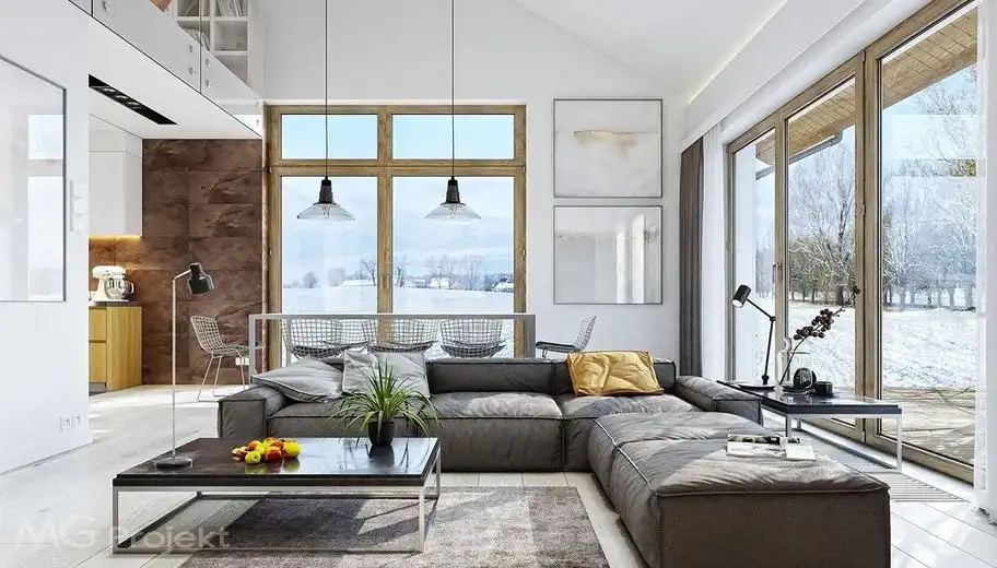 Okna trzy-szybowe w kolorze orzech w ciepłym montażu (taśm izolacyjna od wewn. i zewn.), okno tarasowe przesuwne. Ramki dystansowe szyb w kolorze ram okiennych. Wnętrze domu bardzo dobrze doświetlone przez duże okna. Wewnątrz budynku rozprowadzona instalacja kanalizacyjna oraz wykonano system kominowy typu Schiedel. W całym budynku wykonano posadzkę z chudego betonu.