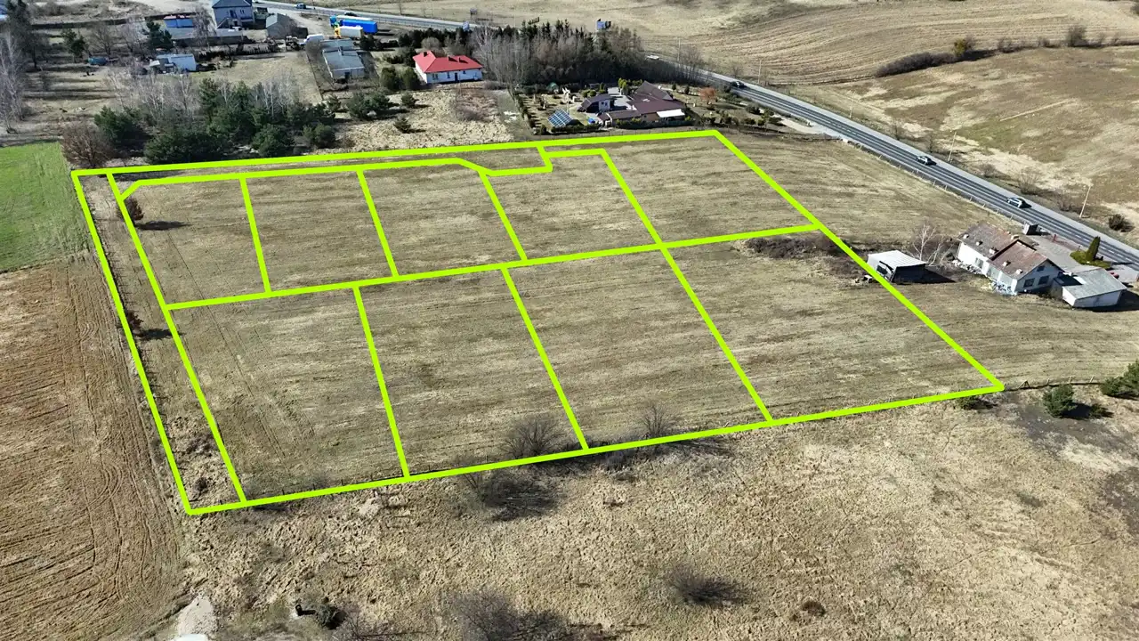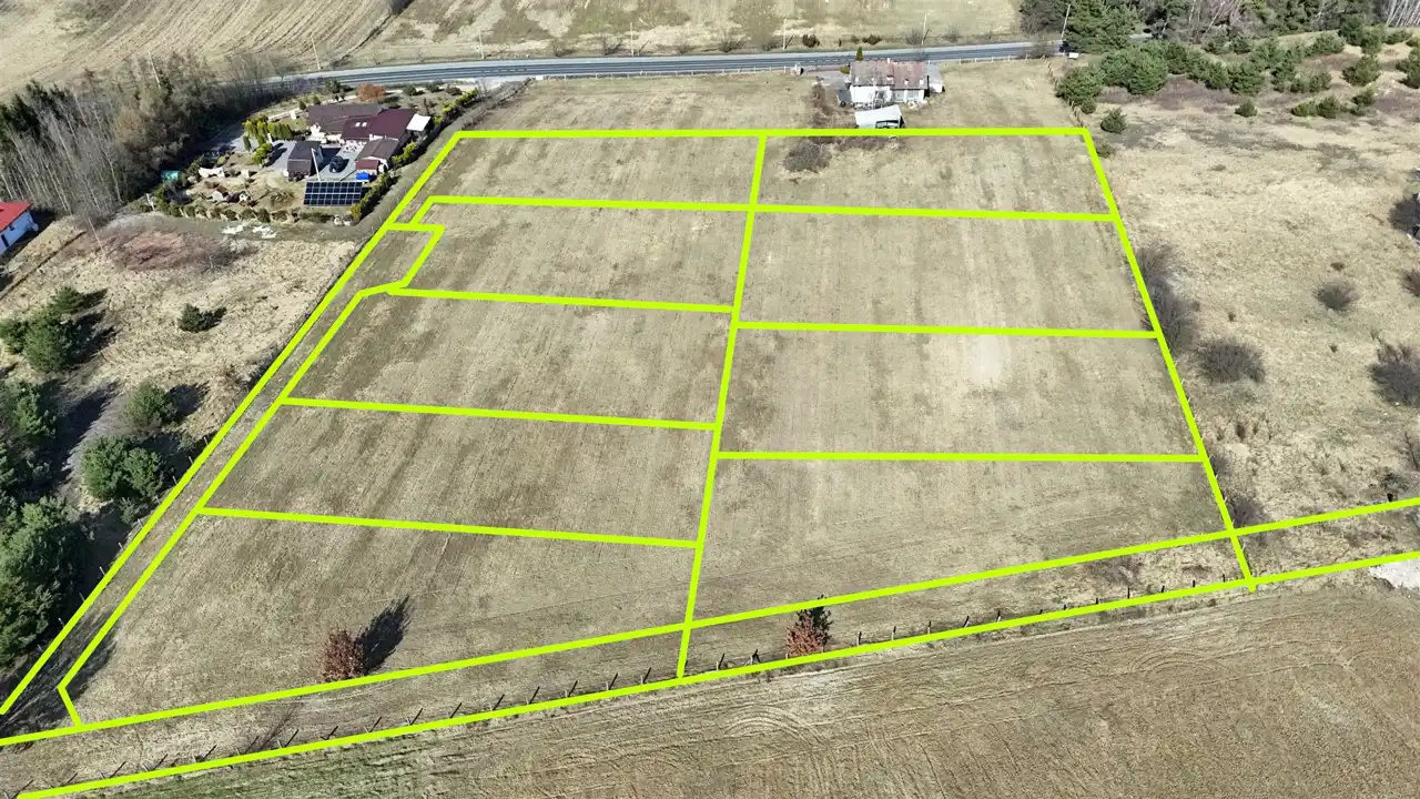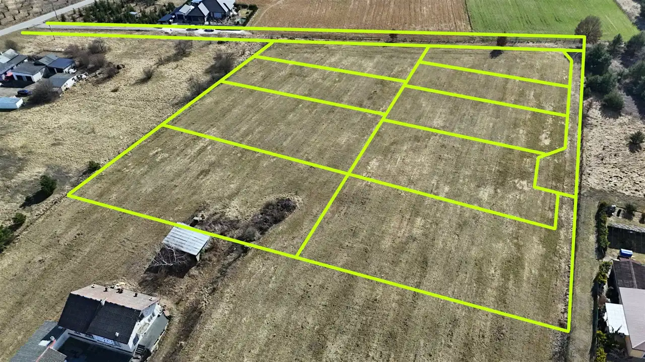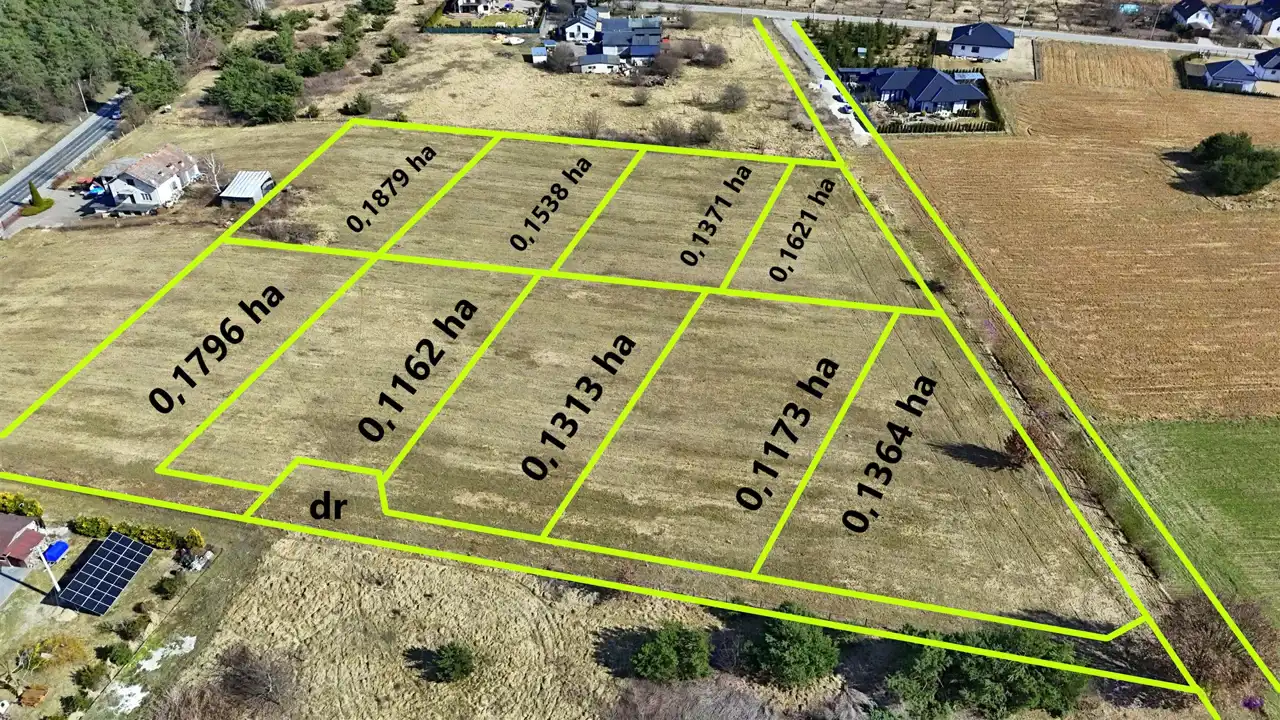 Działki o powierzchni od 1162 m2 do 1879 m2 w cenie 105 zł/m2. Woda i prąd obok działek.