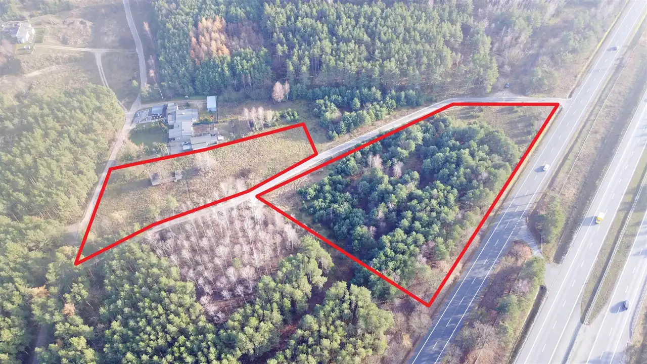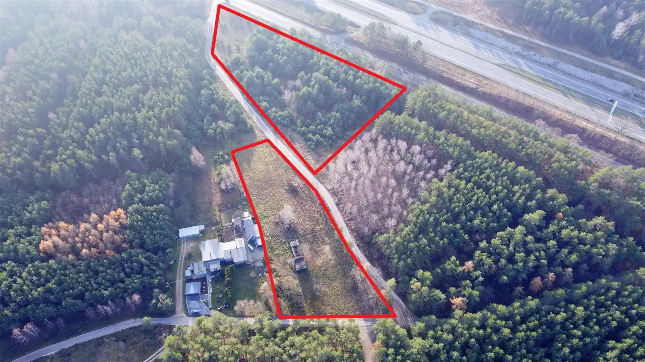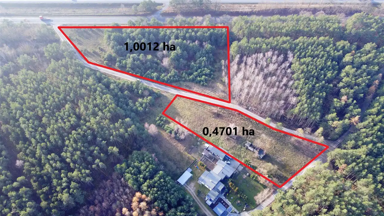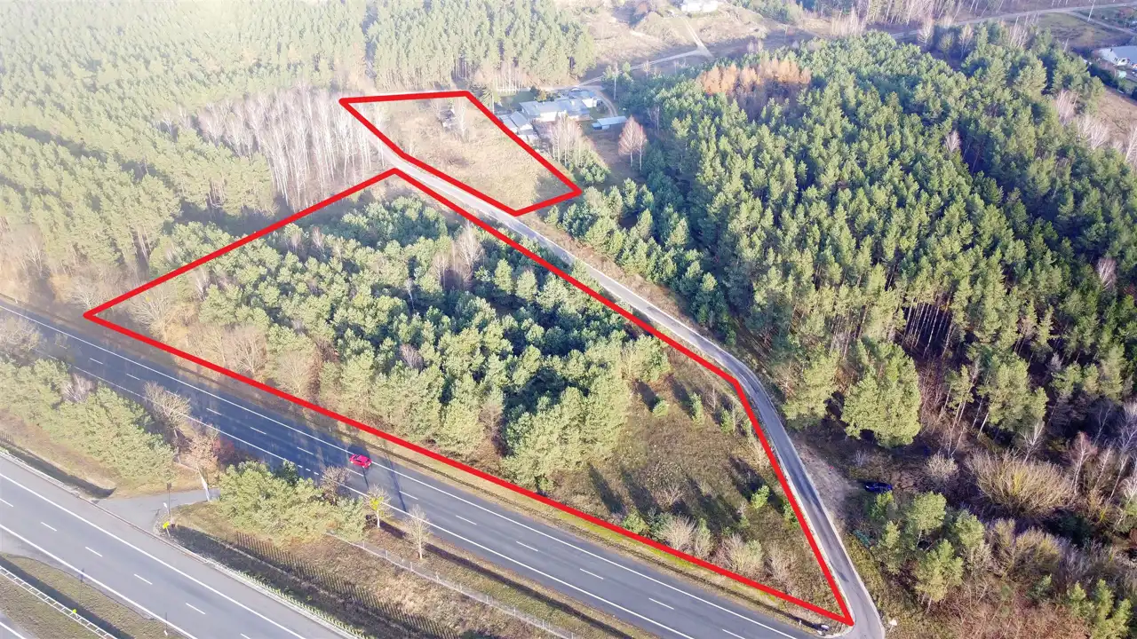 Działka większa przylega frontem szerokości 164 metrów do drogi krajowej co daje bardzo dobrą ekspozycję.