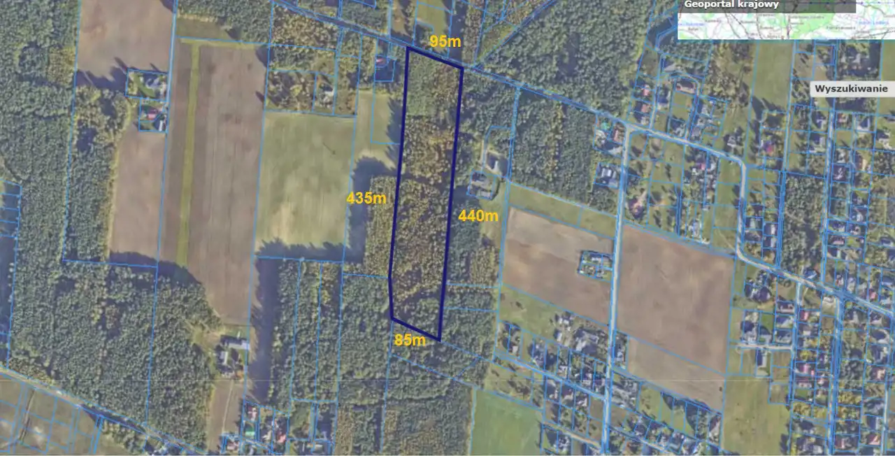 Powierzchnia nieruchomości - 3,6300 ha. Kształt i przybliżone wymiary na rzucie.