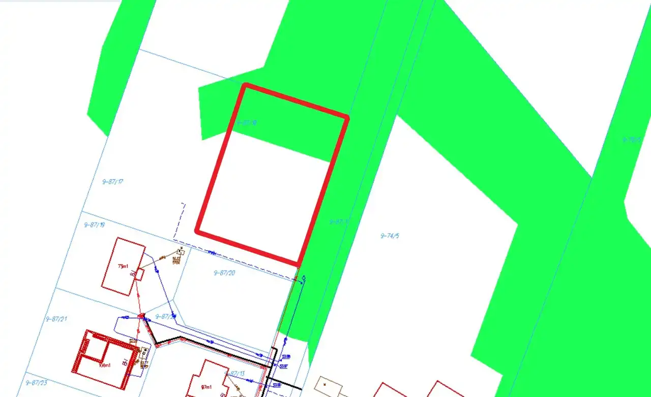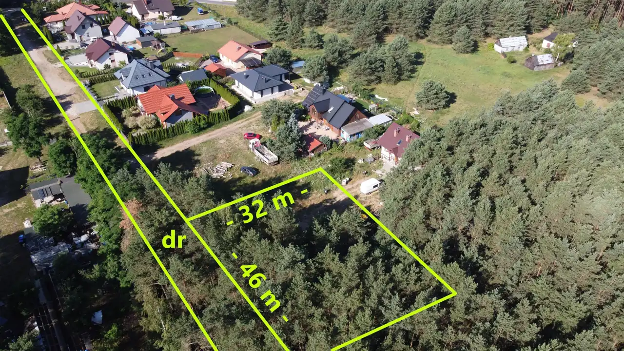 Działka o wymiarach 46 x 32 m. Woda i prąd w pasie drogowym obok działki.