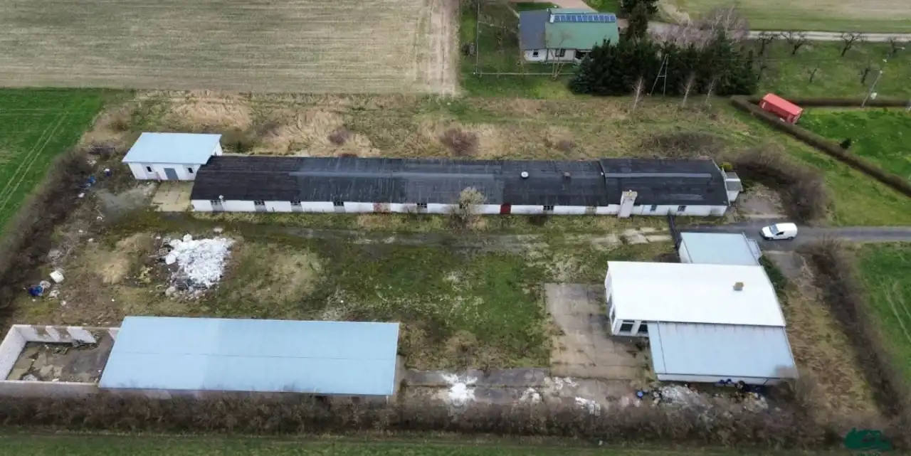 Działka o nr 44/4 posiada 4 budynki .Budynek znajdujący się po prawej stronie {największy}posiada cztery pomieszczenia które pełniły funkcję biura, kotłownię z piecem , toaletę oraz cztery pomieszczenia magazynowe przemysłowe przeznaczone do produkcji( w kształcie prostokątów) 682 m2 wybudowany 1964roku. Za nim ( przy nim) stoi najmniejszy budynek o powierzchni ok 77m2 usytuowany jest na samym końcu-pobudowany w 2006r. Posiada drzwi garażowe .Wszystkie pomieszczenia wymagają remontu i odświeżenia.