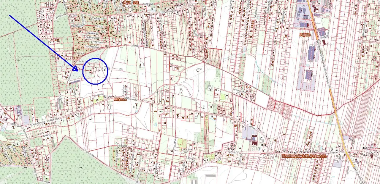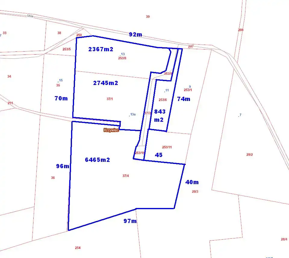 Wymiary działki: front ok. 80 m, głębokość ok. 248 m, kształt: nieregularny