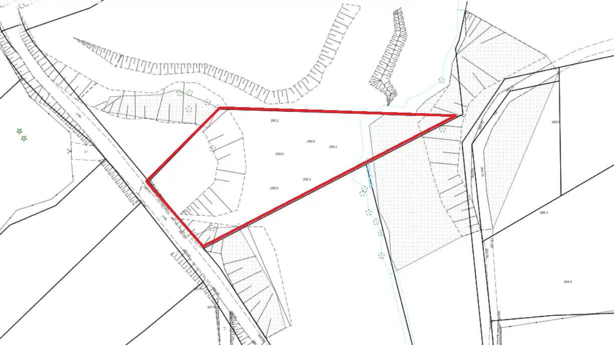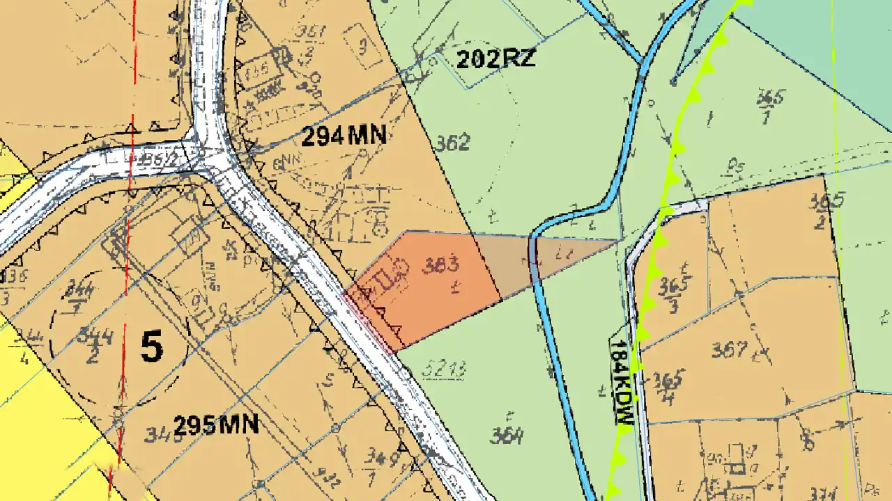 Działka z bezpośrednim zjazdem z drogi publicznej, ze starym domem (do rozbiórki). Działka objęta miejscowym planem zagospodarowania przestrzennego. Powierzchnia terenu budowlanego wynosi ok. 12 arów, o symbolu 294 MN (tereny zabudowy mieszkaniowej jednorodzinnej), na pozostałej pow. ok. 4 arów, na terenach rolniczych zadrzewionych i zakrzewionych. Teren budowlany o podstawowym przeznaczeniem pod zabudowę mieszkaniową jednorodzinną. W/g MPZP, maksymalna pow. zabudowy wynosi 25%, pow. biologicznie czynna: min: 60%. Max. wysokość zabudowy mieszkaniowej - do 11 m.