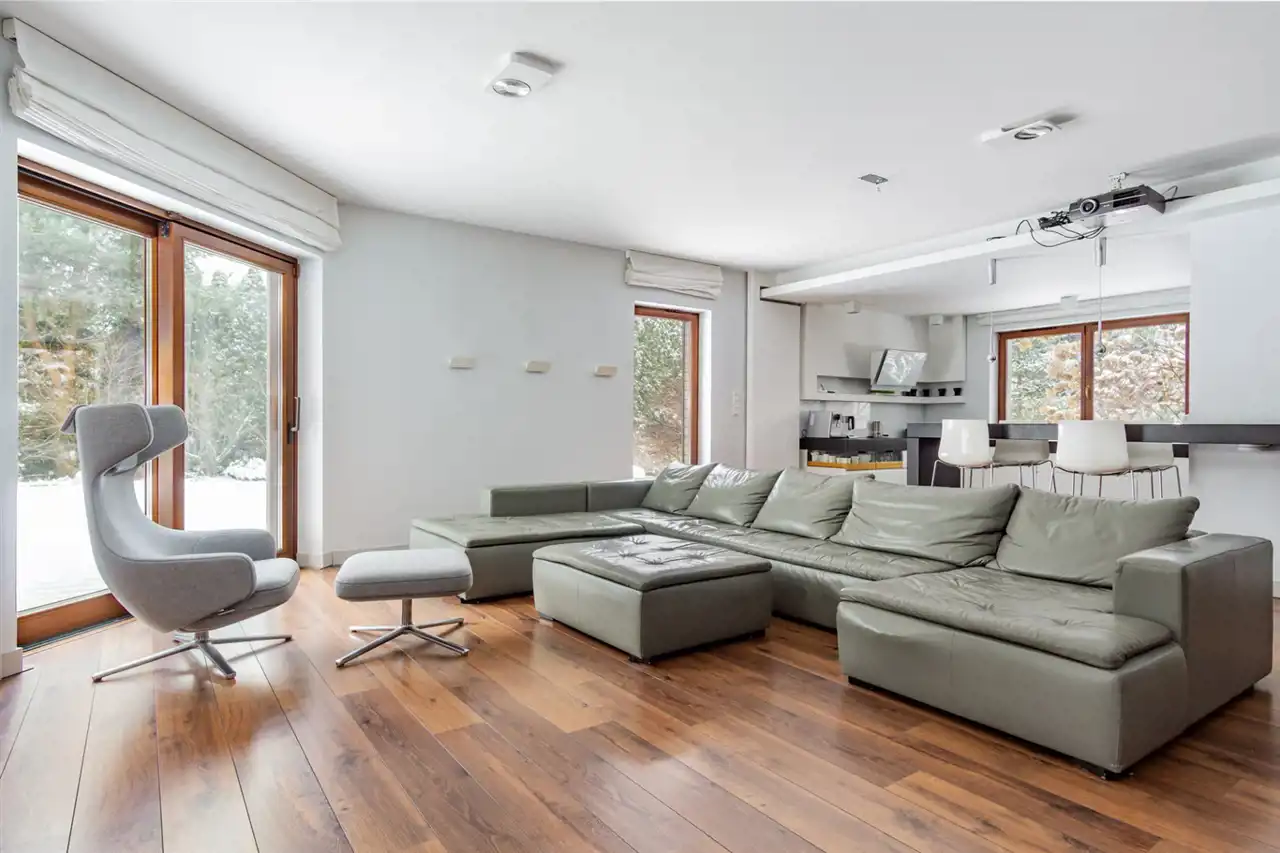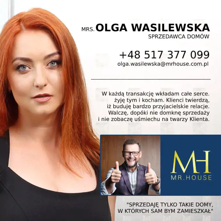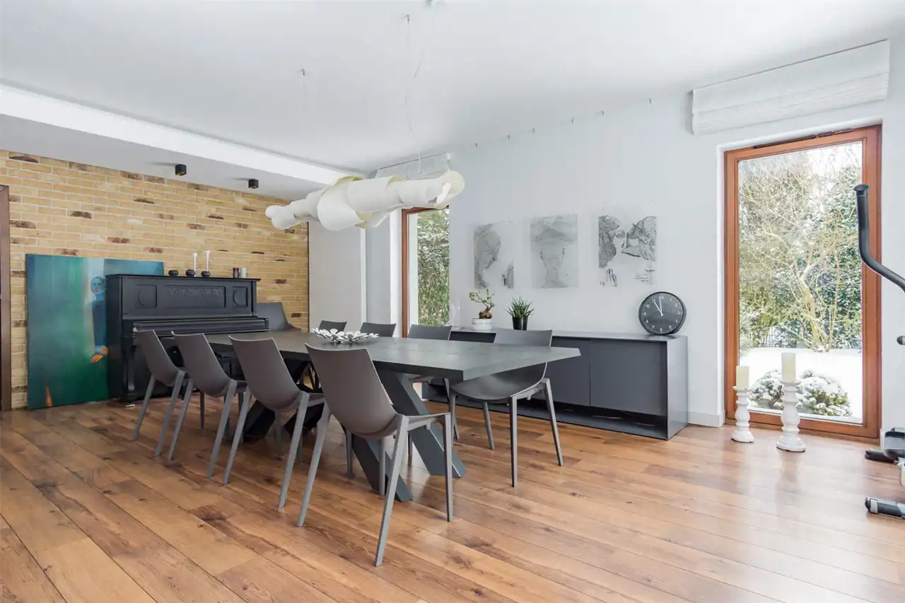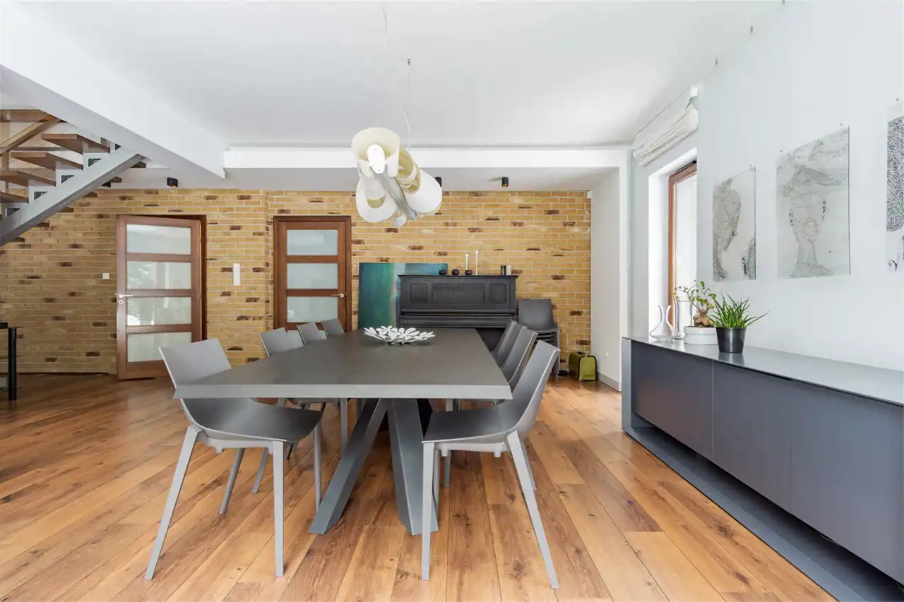 Dom jest duży, modnie i ponadczasowo urządzony. Zachwyca salon z olbrzymią kanapą i kominkiem, jadalnią i półotwartą kuchnią dającą możliwość wspólnego spędzanie czasu całej rodzinie. Duże okna tarasowe łączą salon z tarasem z drzewa egzotycznego, ta przestrzeń zachęca do urządzania przyjęć czy barbecue z przyjaciółmi. Ponadczasowe drewno, modna cegła, jasne kolory i morze światła to musi spodobać się nawet najwybredniejszym poszukiwaczom nowego domu. Niesamowita, bo wysoka, z pięknymi belkami, oryginalnym oświetleniem i lekkimi, jakby lewitującym schodami, klatka schodowa prowadzi do komfortowej przestrzeni prywatnej na piętrze. Tu przestronne, widne sypialnie z garderobami, o których marzy niejedna duża i mała kobietka. Jest i coś dla mężczyzny – rozgrzewająca, relaksująca, regenerująca siły sauna.