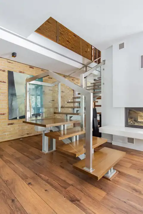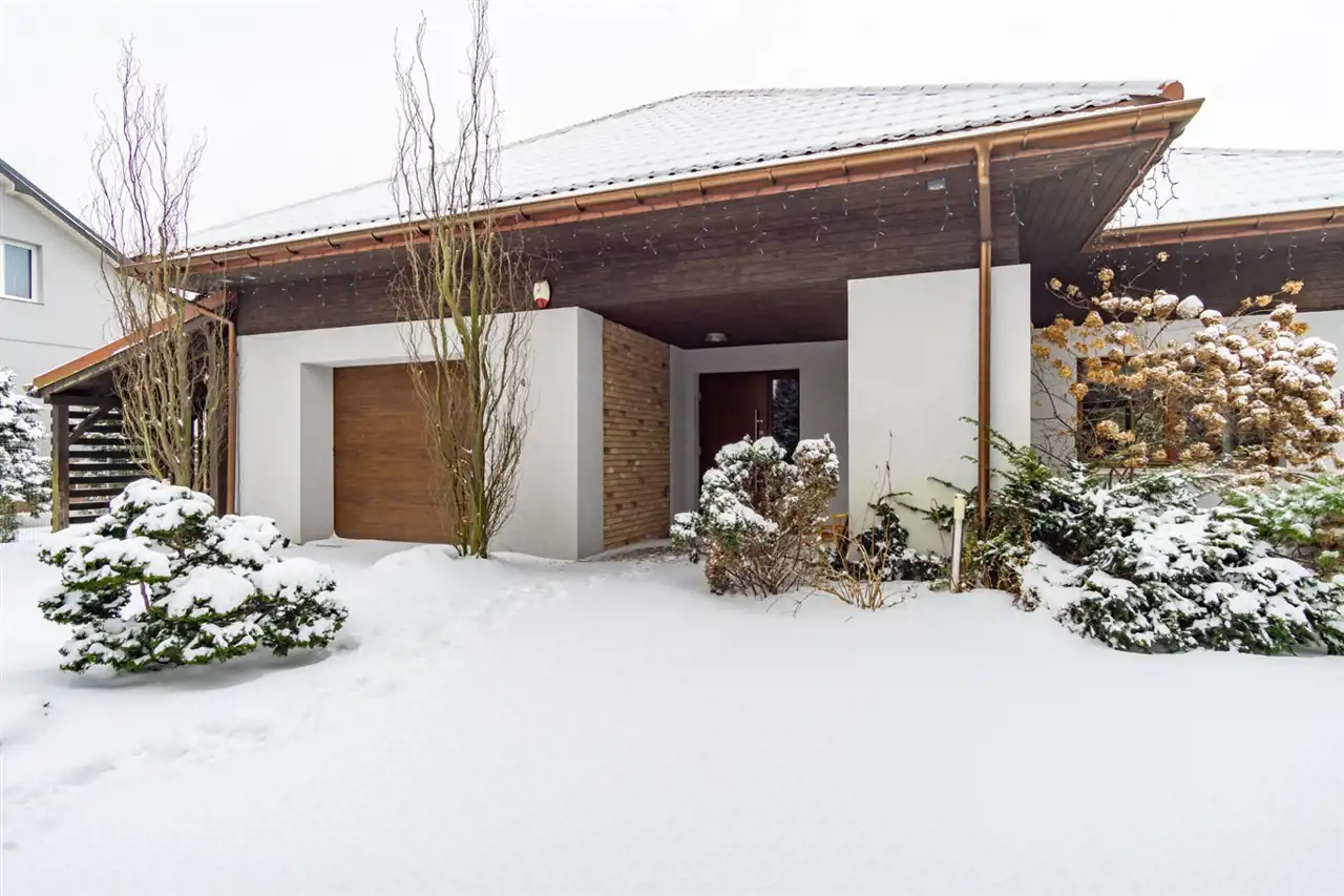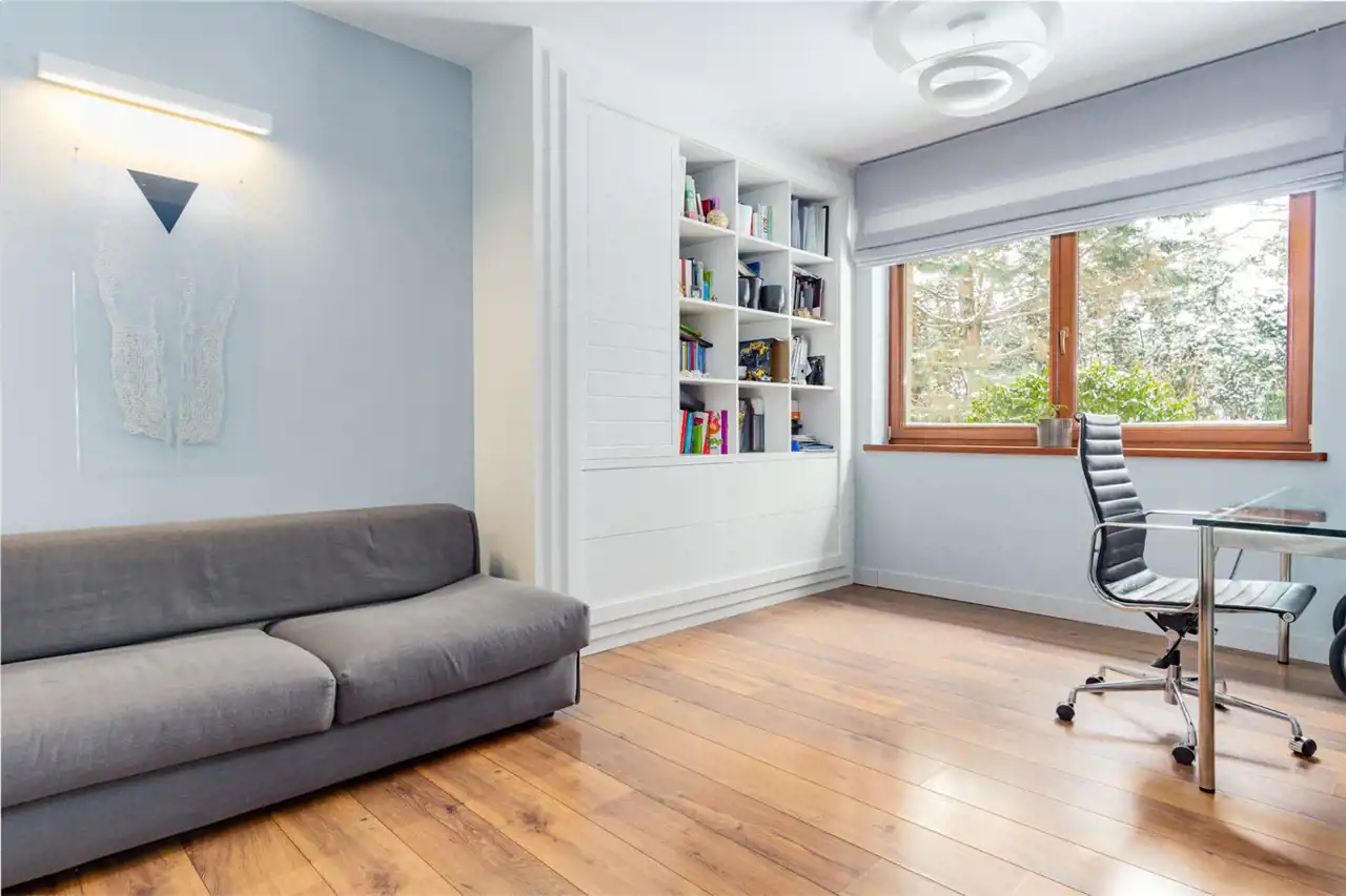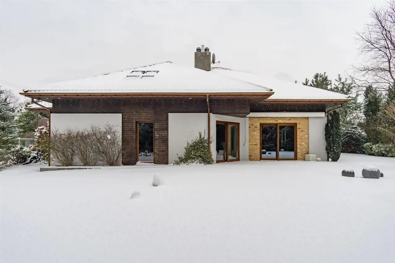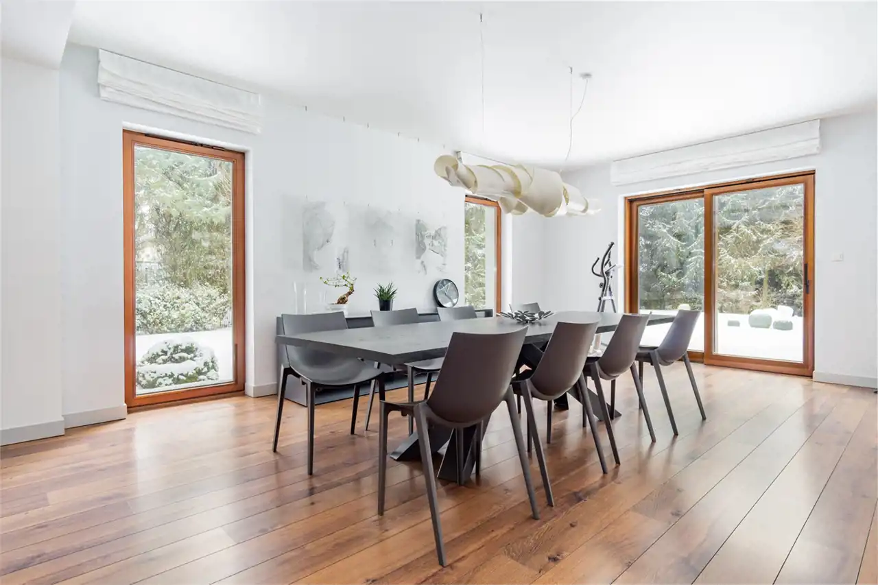 Dom jest duży, modnie i ponadczasowo urządzony. Zachwyca salon z olbrzymią kanapą i kominkiem, jadalnią i półotwartą kuchnią dającą możliwość wspólnego spędzanie czasu całej rodzinie. Duże okna tarasowe łączą salon z tarasem z drzewa egzotycznego, ta przestrzeń zachęca do urządzania przyjęć czy barbecue z przyjaciółmi. Ponadczasowe drewno, modna cegła, jasne kolory i morze światła to musi spodobać się nawet najwybredniejszym poszukiwaczom nowego domu. Niesamowita, bo wysoka, z pięknymi belkami, oryginalnym oświetleniem i lekkimi, jakby lewitującym schodami, klatka schodowa prowadzi do komfortowej przestrzeni prywatnej na piętrze. Tu przestronne, widne sypialnie z garderobami, o których marzy niejedna duża i mała kobietka. Jest i coś dla mężczyzny – rozgrzewająca, relaksująca, regenerująca siły sauna.