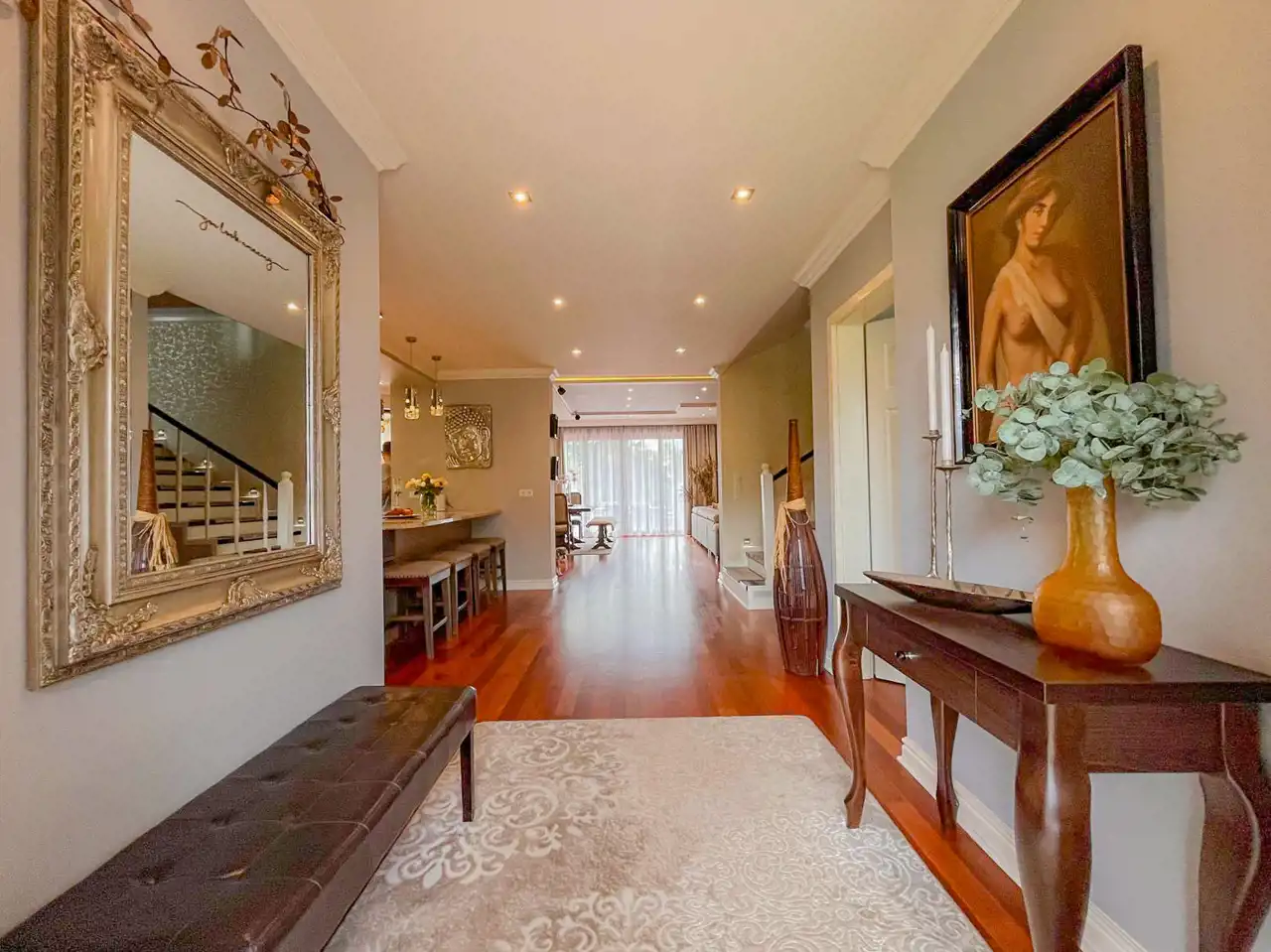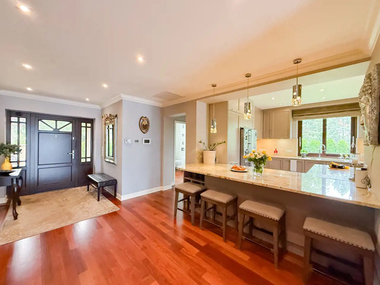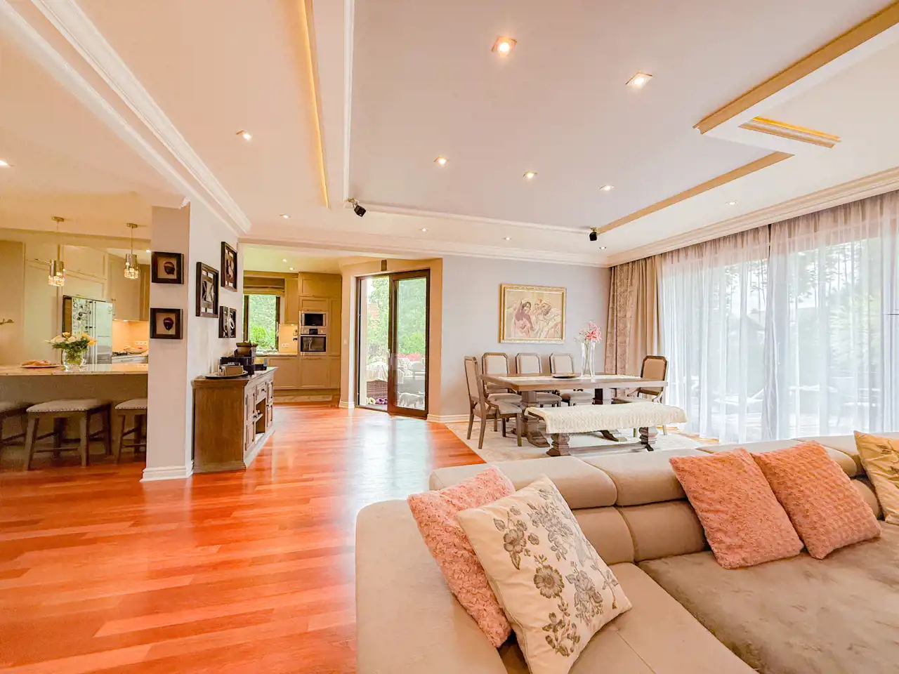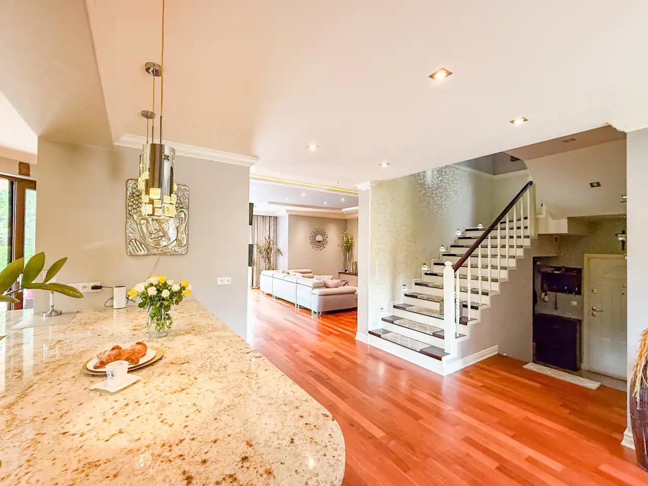 Przestronnie i stylowo zaprojektowane przestrzenie przez projektanta wnętrz to atut, który zdecydowanie podkreśla wyjątkowość tej nieruchomości. Każdy detal robi bardzo pozytywne wrażenie, począwszy od samego wejścia idąc przestronnym przedpokojem. Kierując się na prawo znajdujemy gabinet, po lewej toaleta dla gości wraz z zamknięta pralnią. Od wejścia zachwyca widok otwartej części salonowej i kuchennej. Aranżacja wnętrza sprawia, że czujemy się tu jak na planie filmowym.