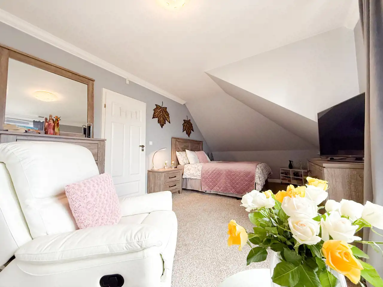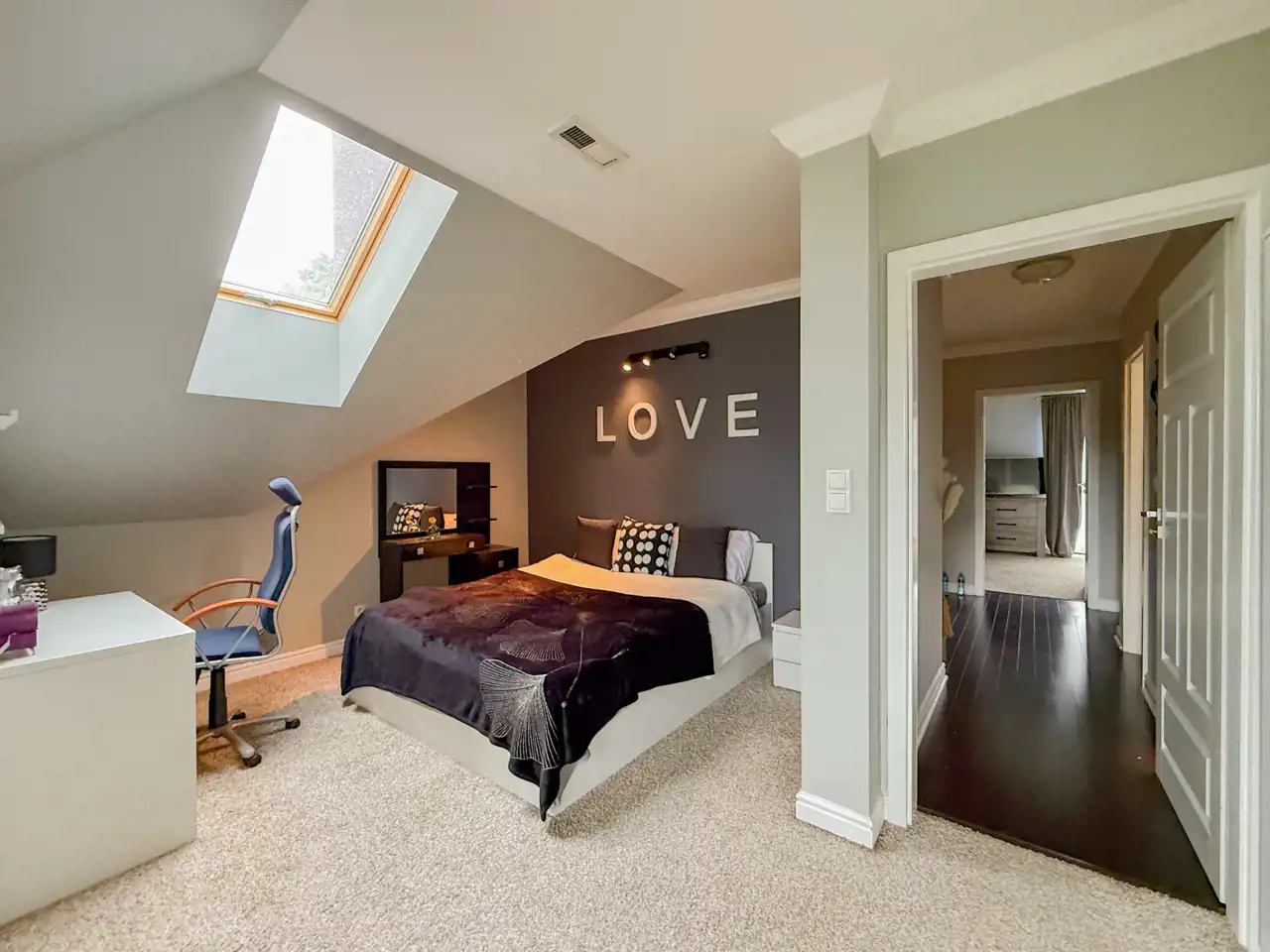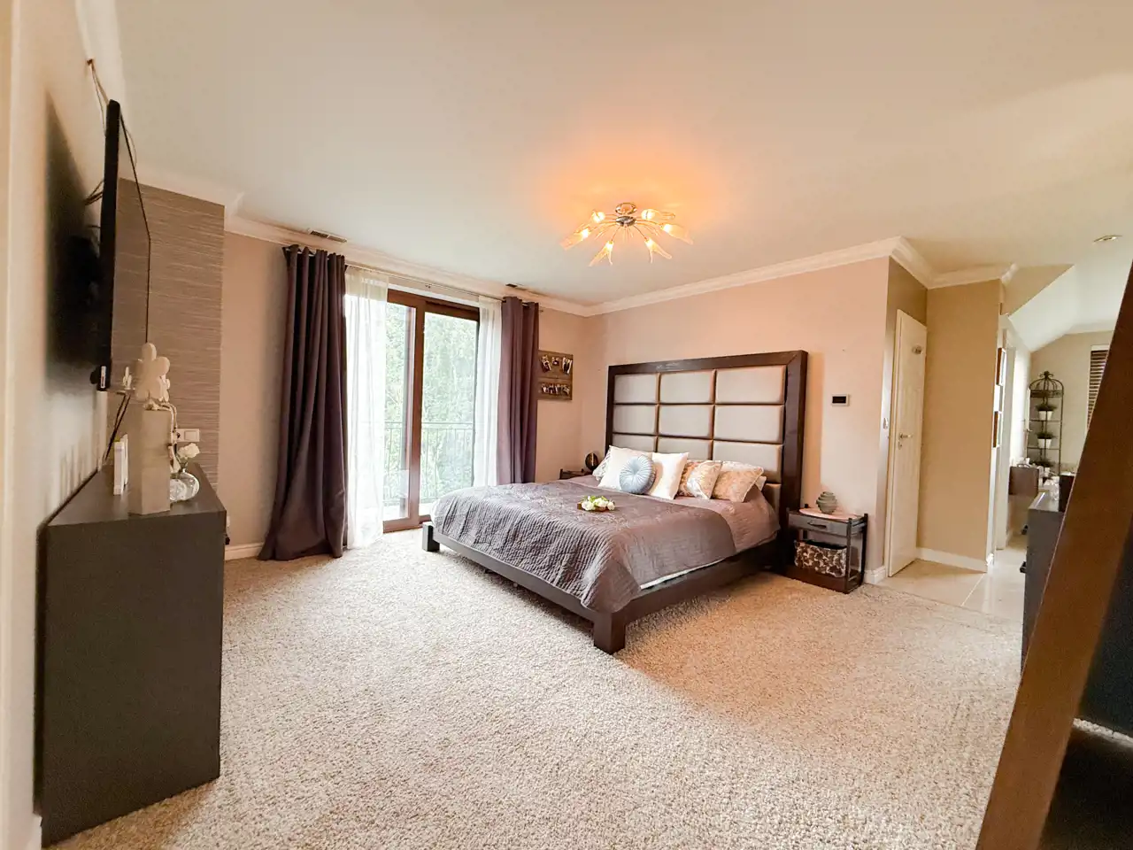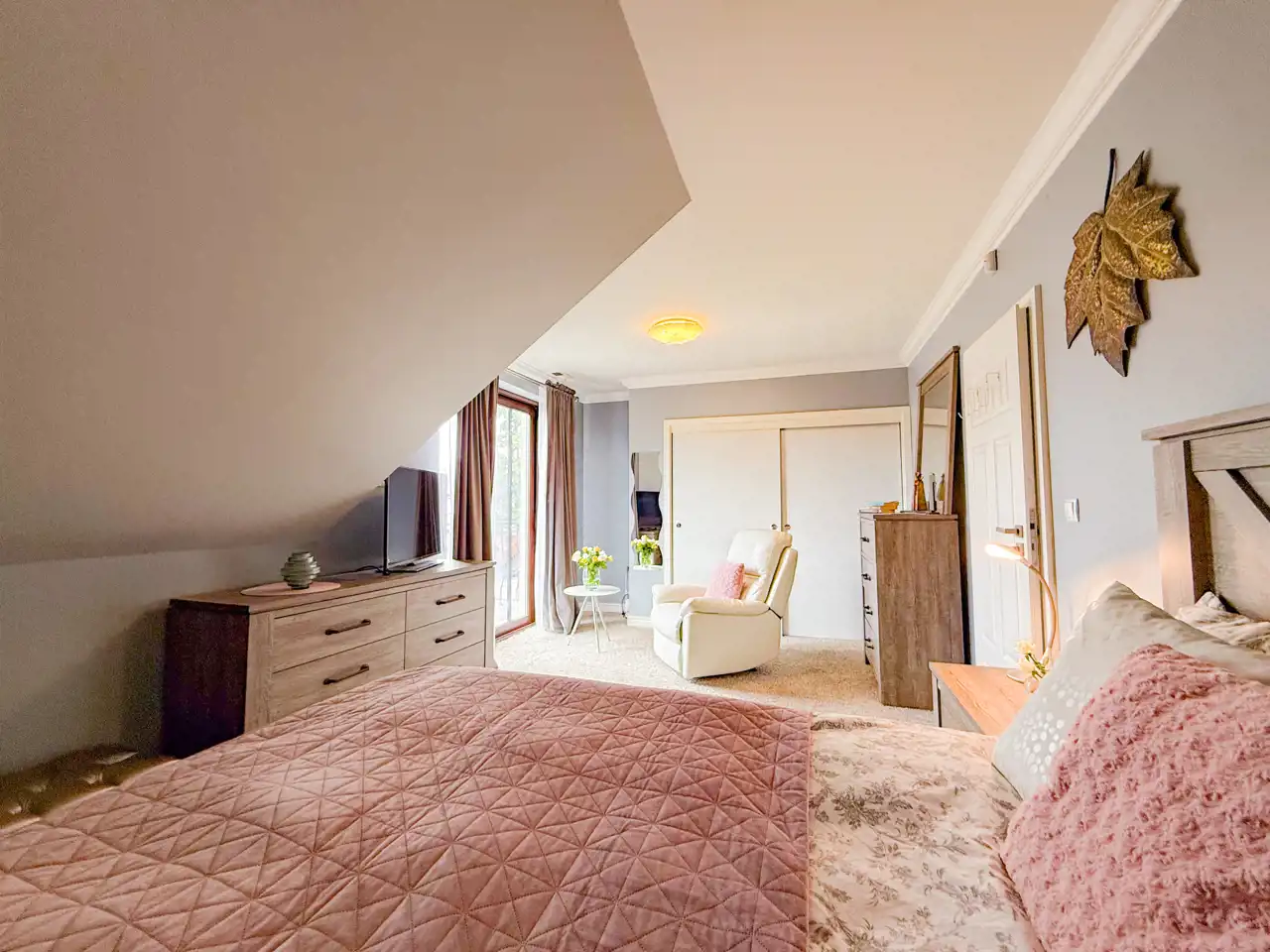 Pierwsza sypialnia jest z balkonem z dużym oknem na stronę od wjazdu na nieruchomość.