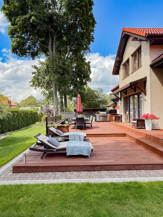 Narożny taras umili nie jednej osobie ulubiony rodzaj relaksu. Można tutaj również zrobić zewnętrzne jacuzzi-wszystko jest przygotowane.