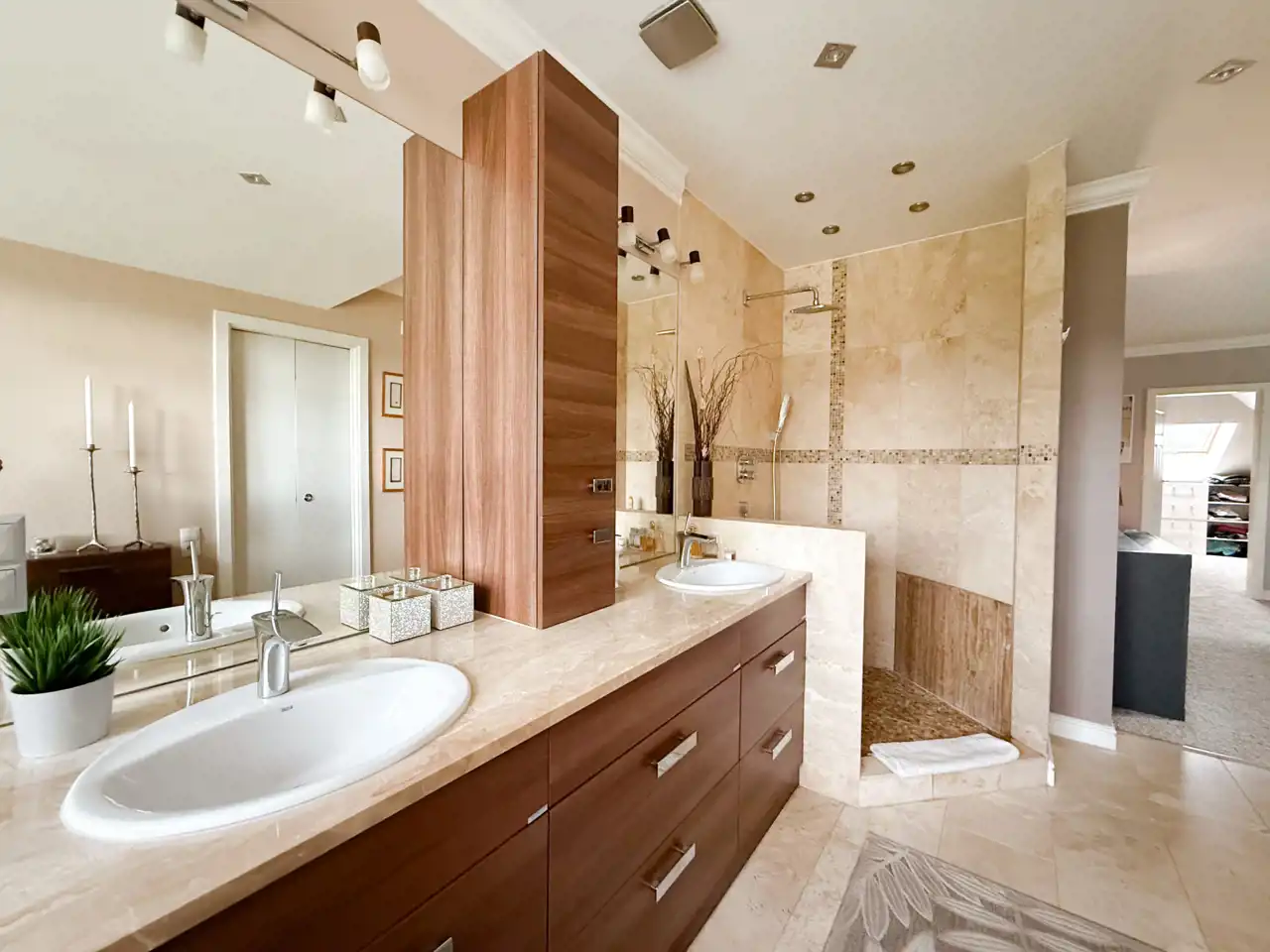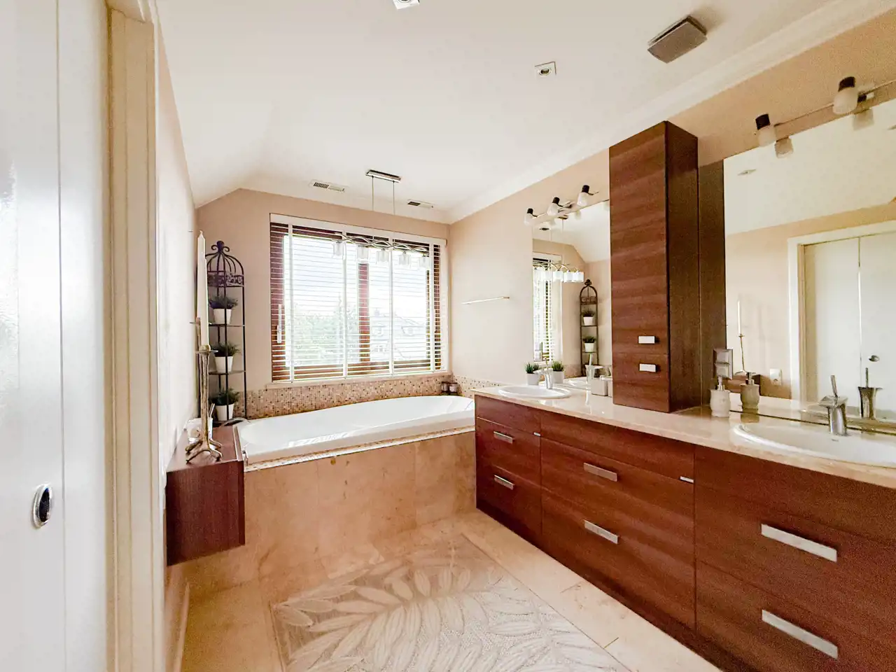 Druga największa sypialnia to przestrzeń do relaksu z otwartym pokojem kąpielowym, zarówno z wanną i prysznicem oraz dwiema umywalkami.