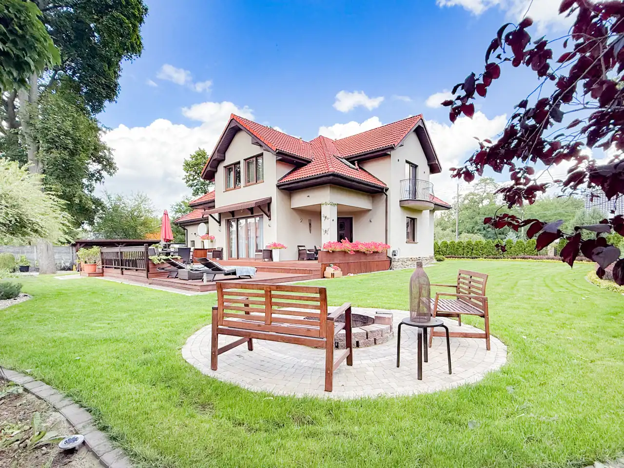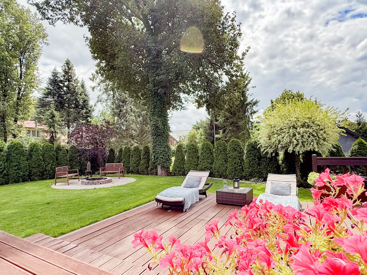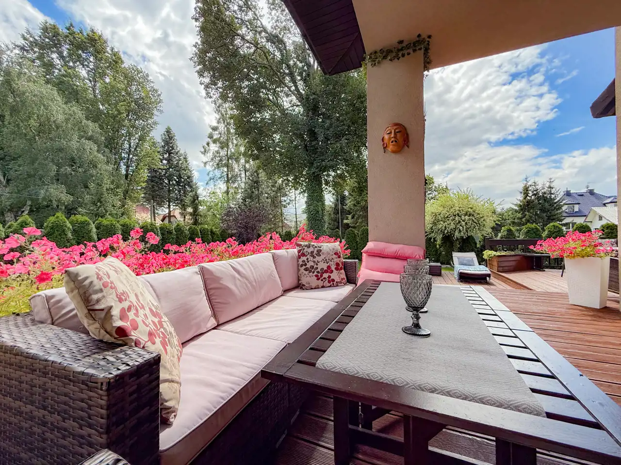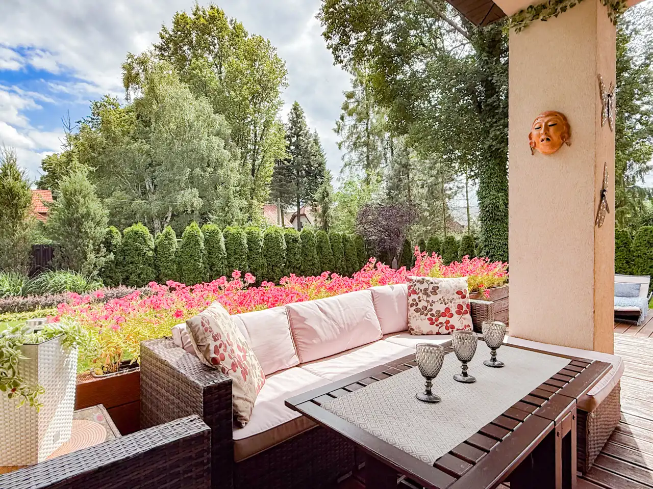 To co znajduje się na zewnątrz z pewnością jeszcze bardziej Cie zachwyci... przepięknie zagospodarowany ogród(z systemem nawadniającym) po 2 stronach budynku daje możliwości swobodnego relaksu, to miejsce do opalania się oraz przyjmowania gości lub po prostu intymnej, prywatnej przestrzeni. Teren jest ogrodzony i zadrzewiony, sąsiedztwo nie jest praktycznie widoczne. Liczne nasadzenia i bardzo zadbany trawnik sprawiają że można cieszyć się naturą cały rok.