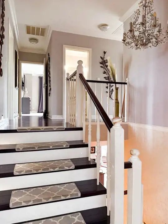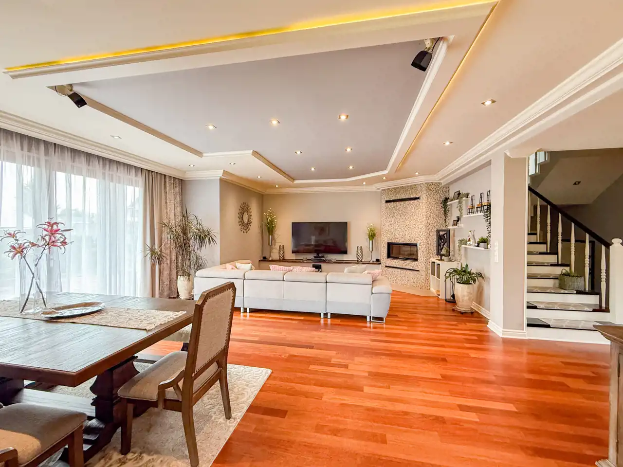 Pośrodku salonu na piętro prowadzą klimatyczne schody. Stylistyka malowania oraz dekoracje, dają efekt klasy i zarazem przytulności.