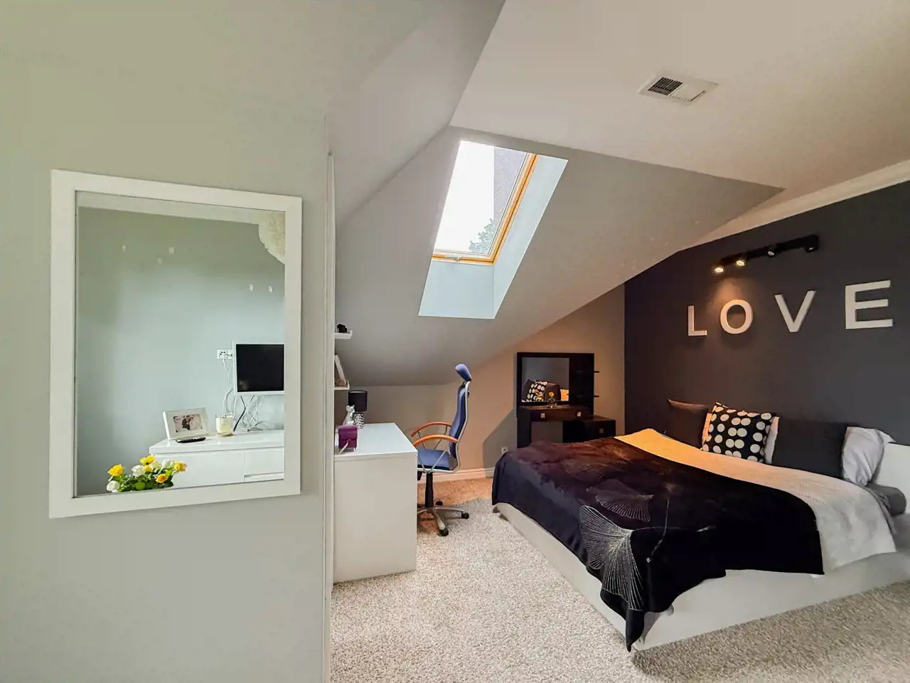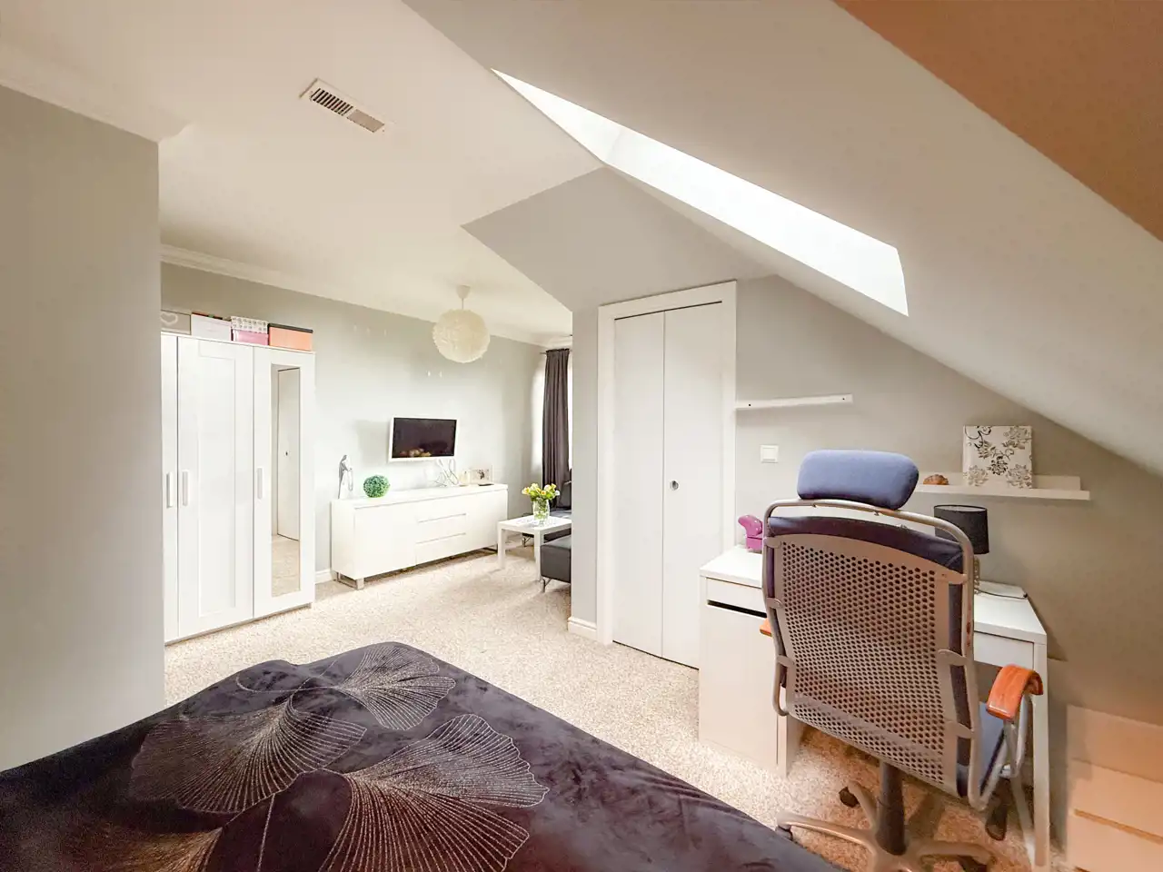 Przechodząc pół pietra wyżej mamy przestrzeń sypialnianą, która składa się z: