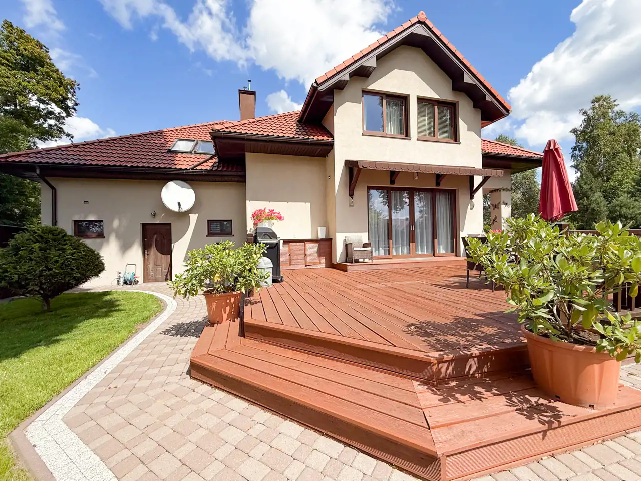 Grill party na tarasie to gratka dla amatorów biesiadowania a duża przestrzeń na działce o powierzchni 1034 m2 pozwala na dalsze aranżacje wedle potrzeb rodzinnych.