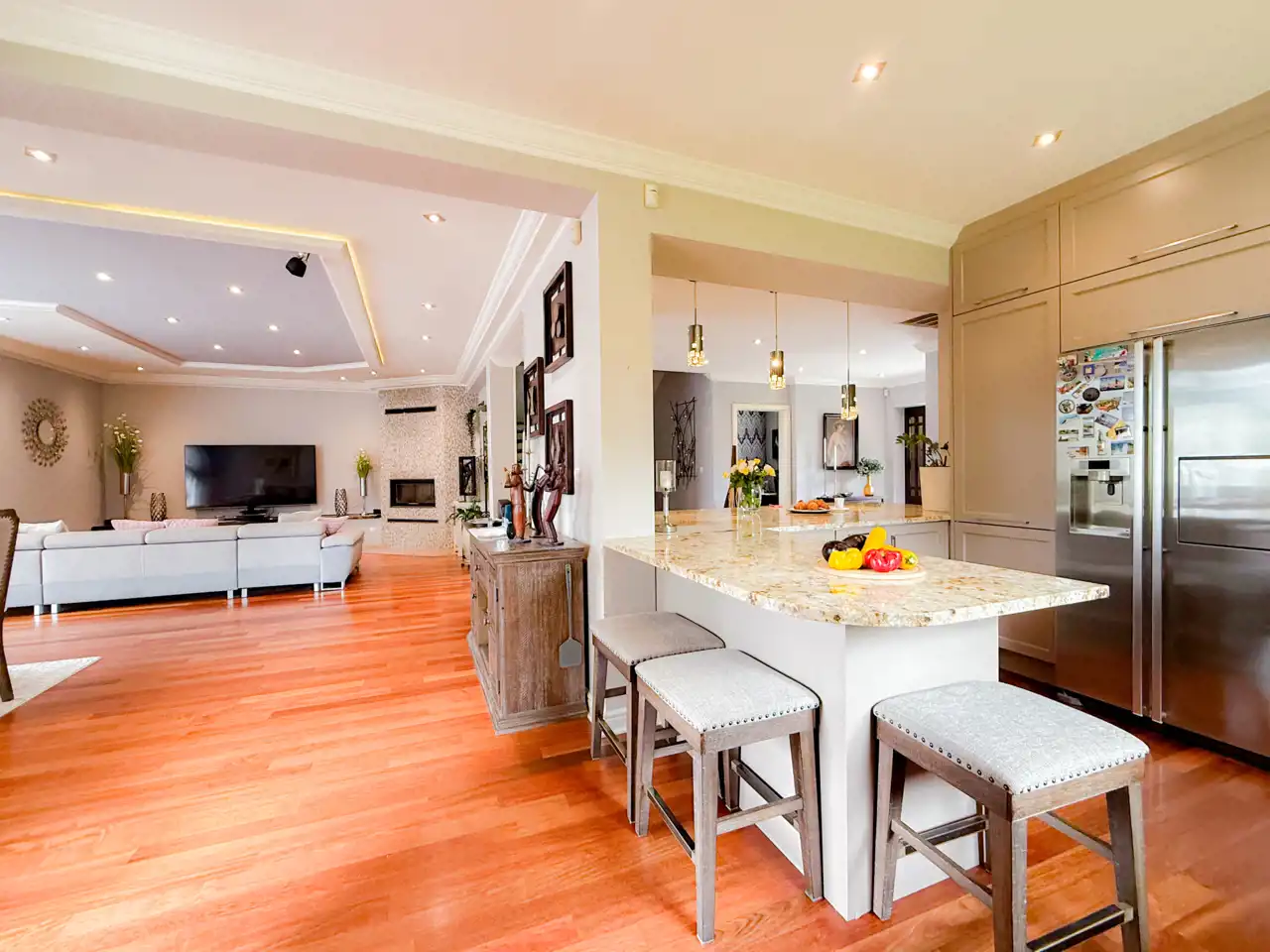 Mijając gabinet na lewo pojawia się ogromna wyspa kuchenna która zaprasza aby wygodnie się rozgościć.
