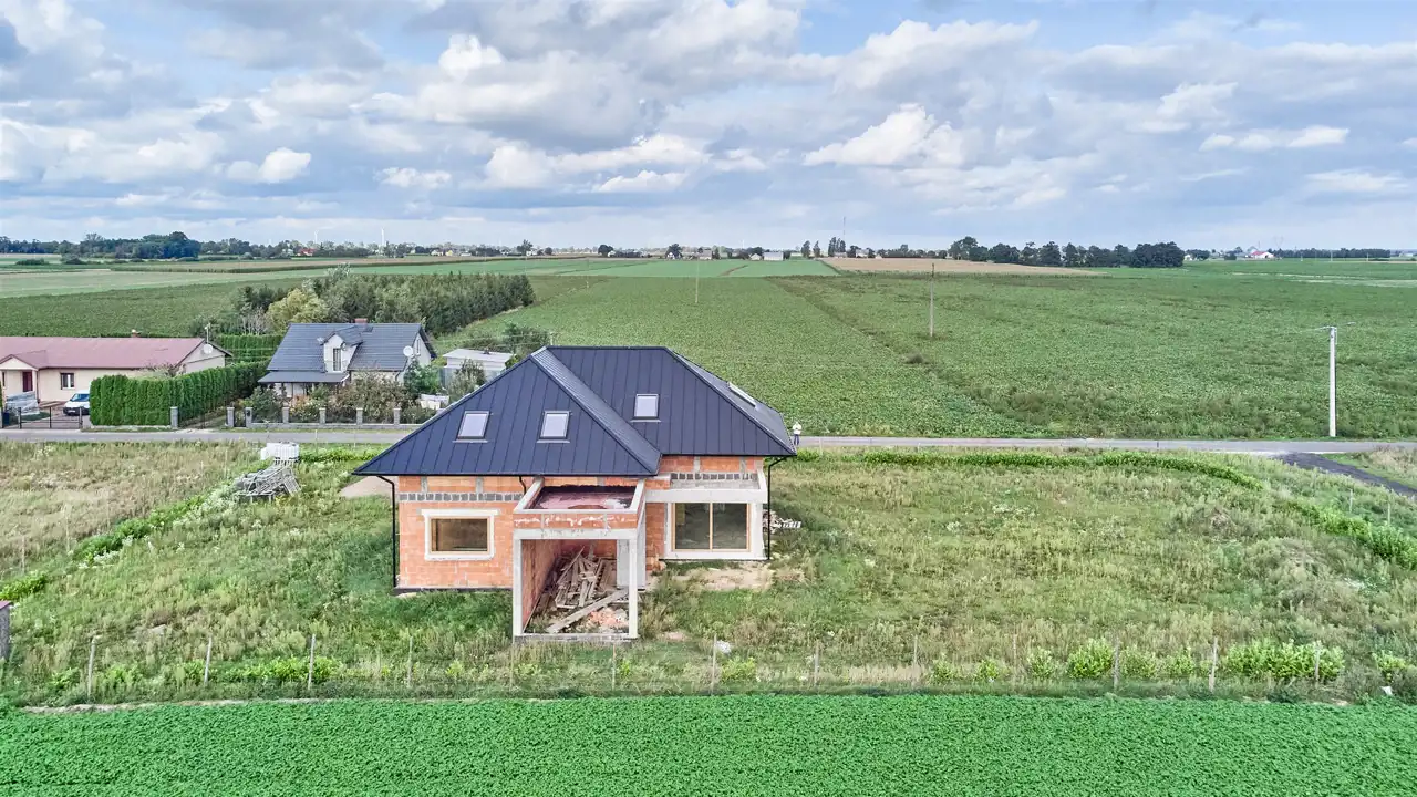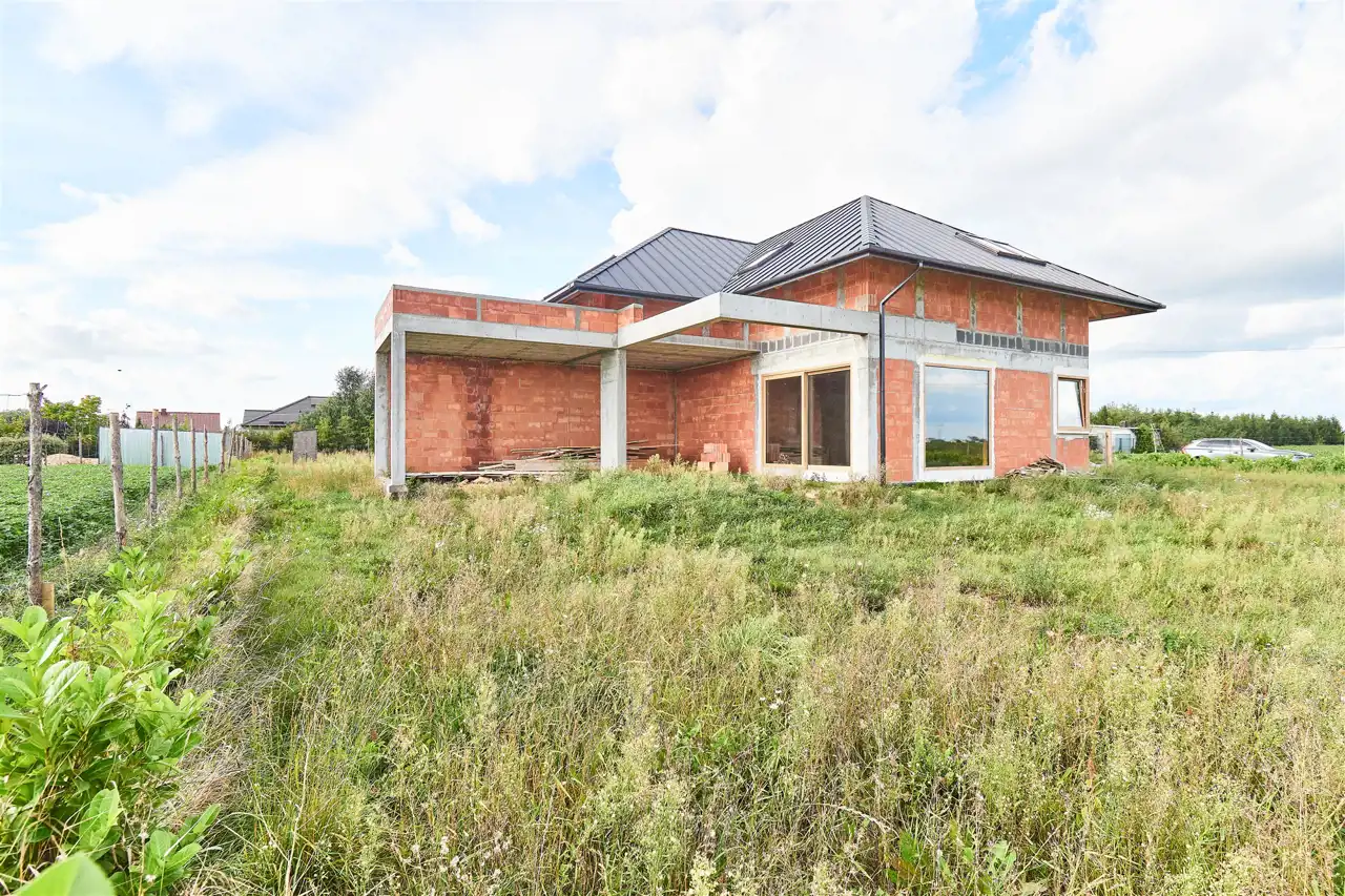 Budynek mieszkalny wolnostojący, sześciopokojowy, z poddaszem użytkowym, bez podpiwniczenia. Wybudowany w 2025 roku, w technologii tradycyjnej, murowanej. Powierzchnia użytkowa domu wynosi 214,73 m2. W bryle budynku znajduje się również dwustanowiskowy garaż o powierzchni 37,34 m2. Budynek w stanie deweloperskim, realizowany podstawie własnego projektu. Dom zaprojektowany pod kątem domu energooszczędnego z pompą ciepła, rekuperacją.
