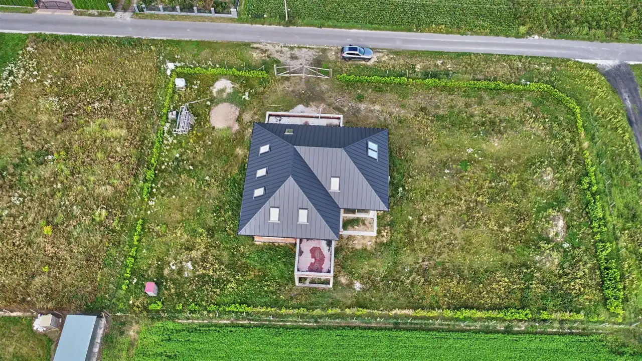 Budynek mieszkalny wolnostojący, sześciopokojowy, z poddaszem użytkowym, bez podpiwniczenia. Wybudowany w 2025 roku, w technologii tradycyjnej, murowanej. Powierzchnia użytkowa domu wynosi 214,73 m2. W bryle budynku znajduje się również dwustanowiskowy garaż o powierzchni 37,34 m2. Budynek w stanie deweloperskim, realizowany podstawie własnego projektu. Dom zaprojektowany pod kątem domu energooszczędnego z pompą ciepła, rekuperacją.