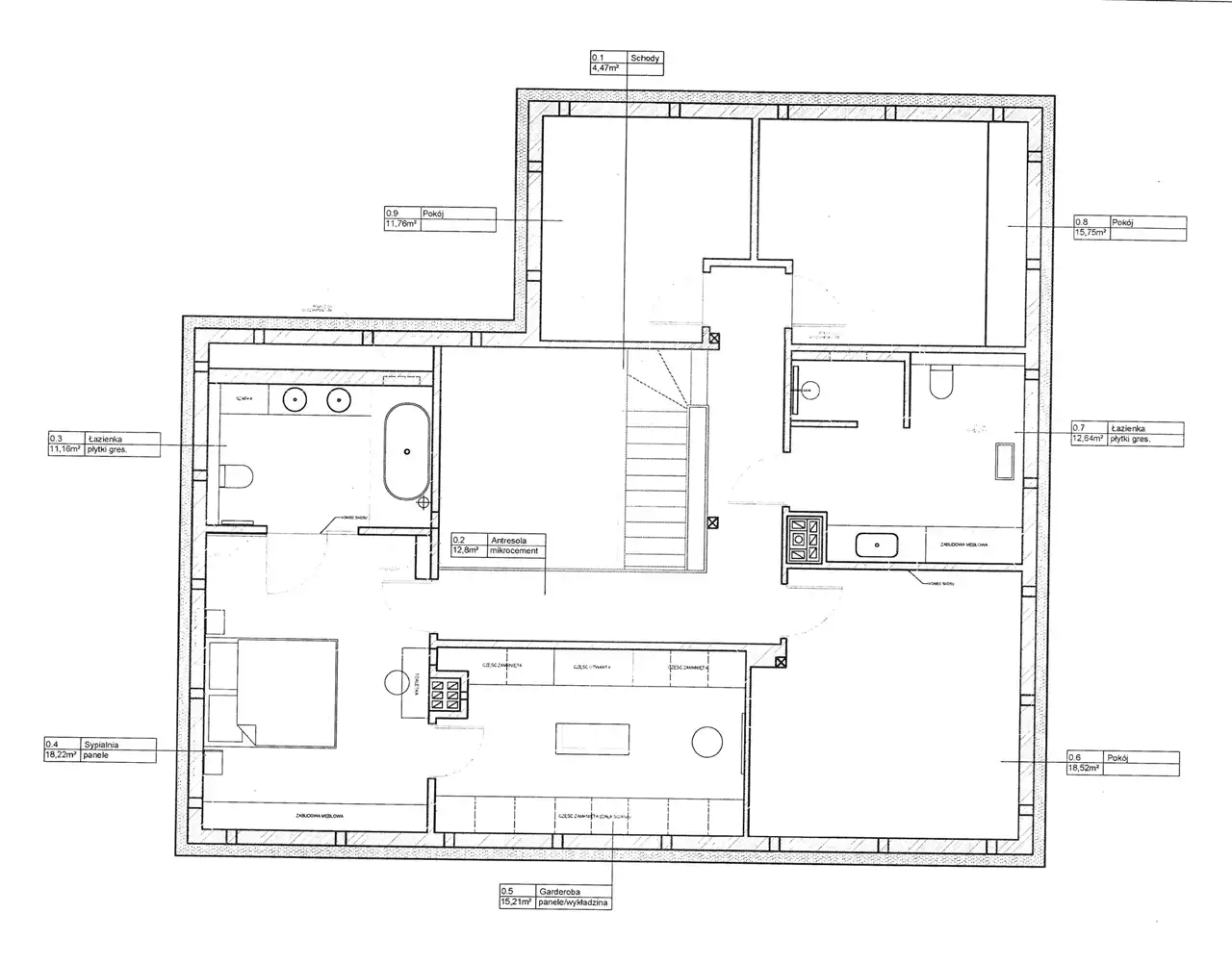 - sypialnia: 18,22 m2 z łazienką 11,16 m2 i garderobą 12,51 m2;