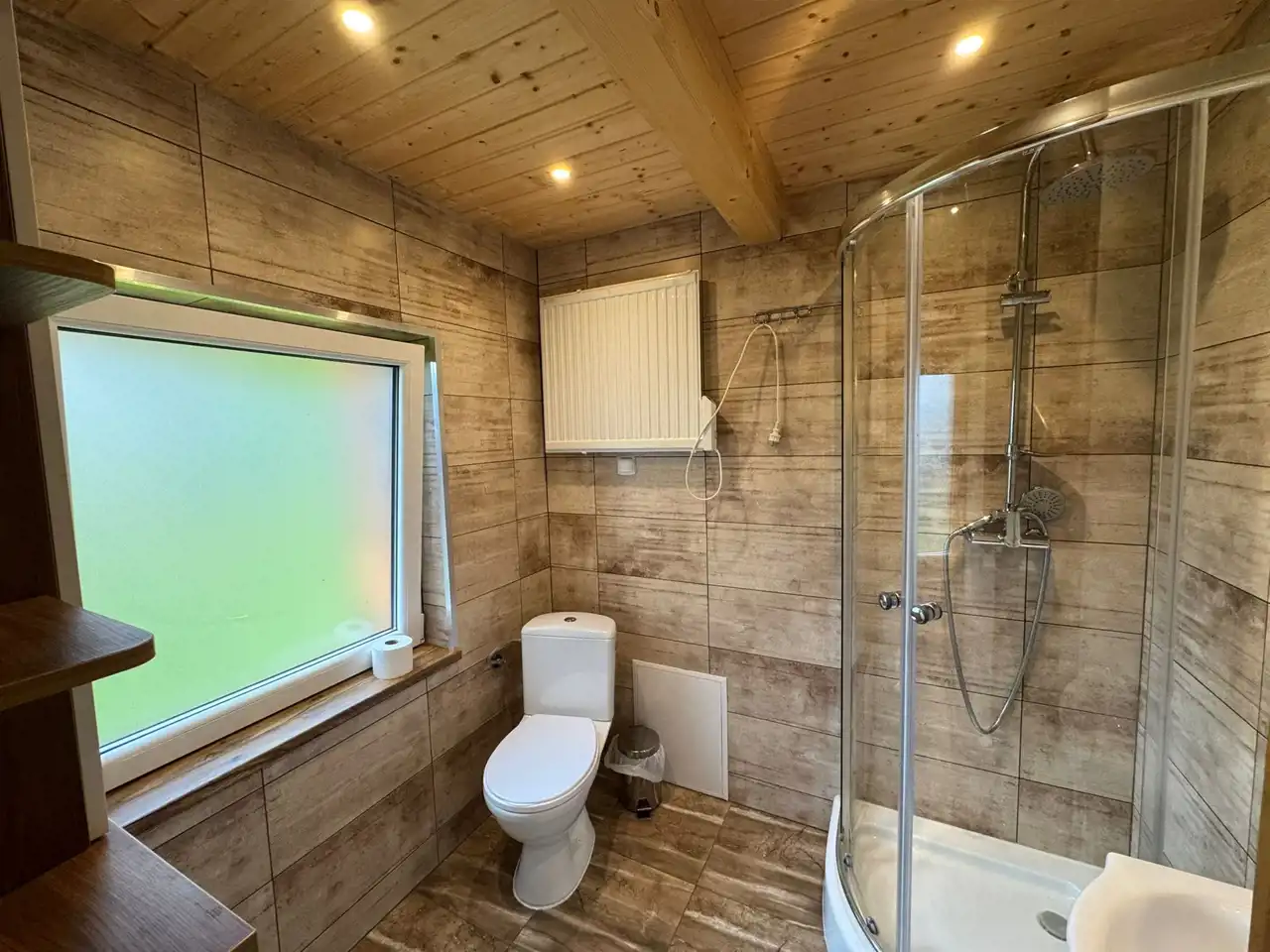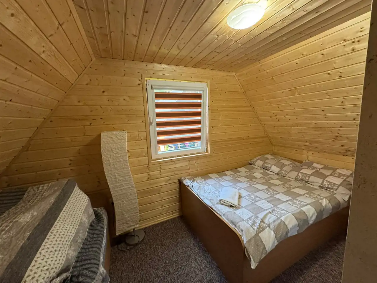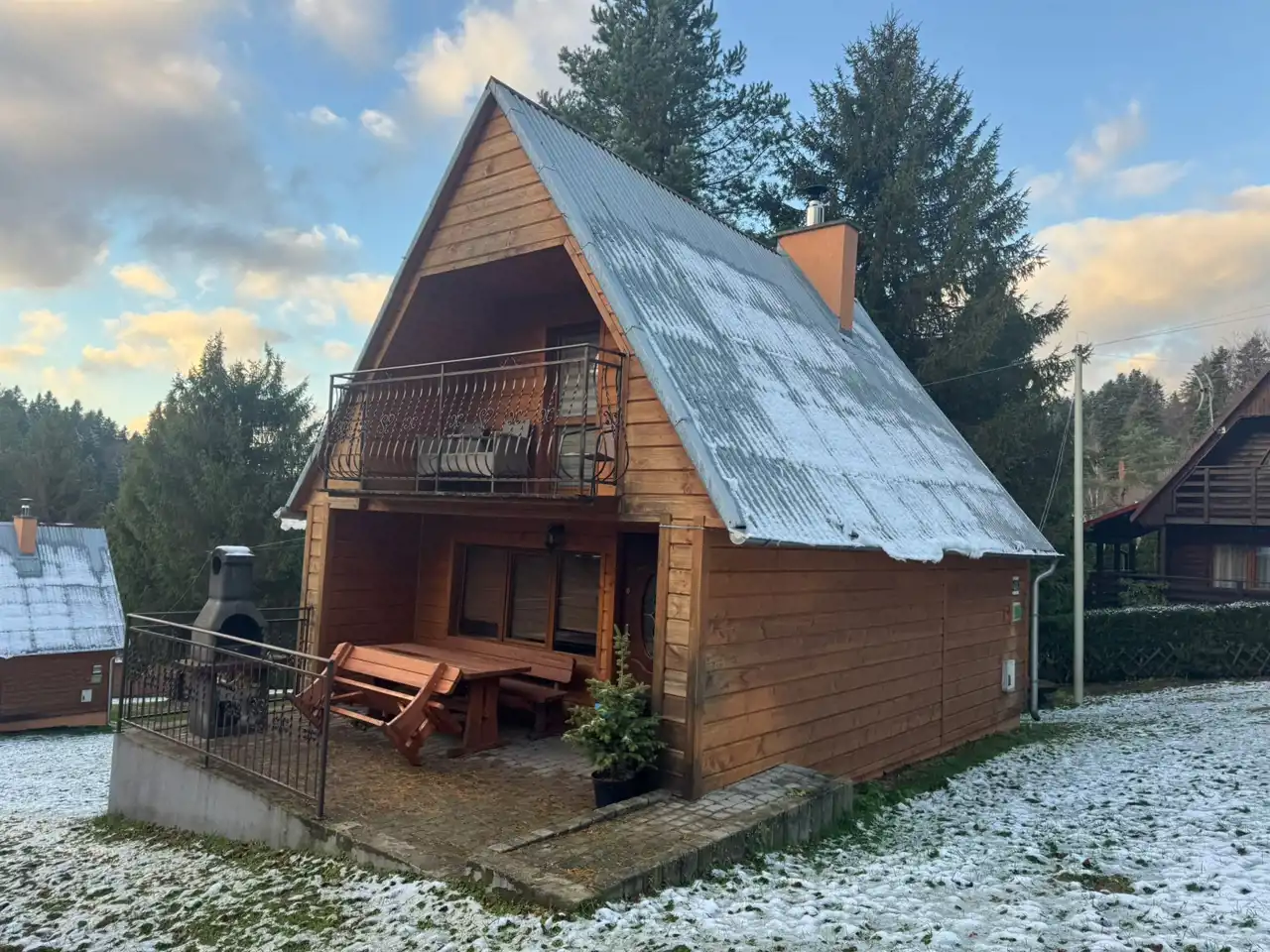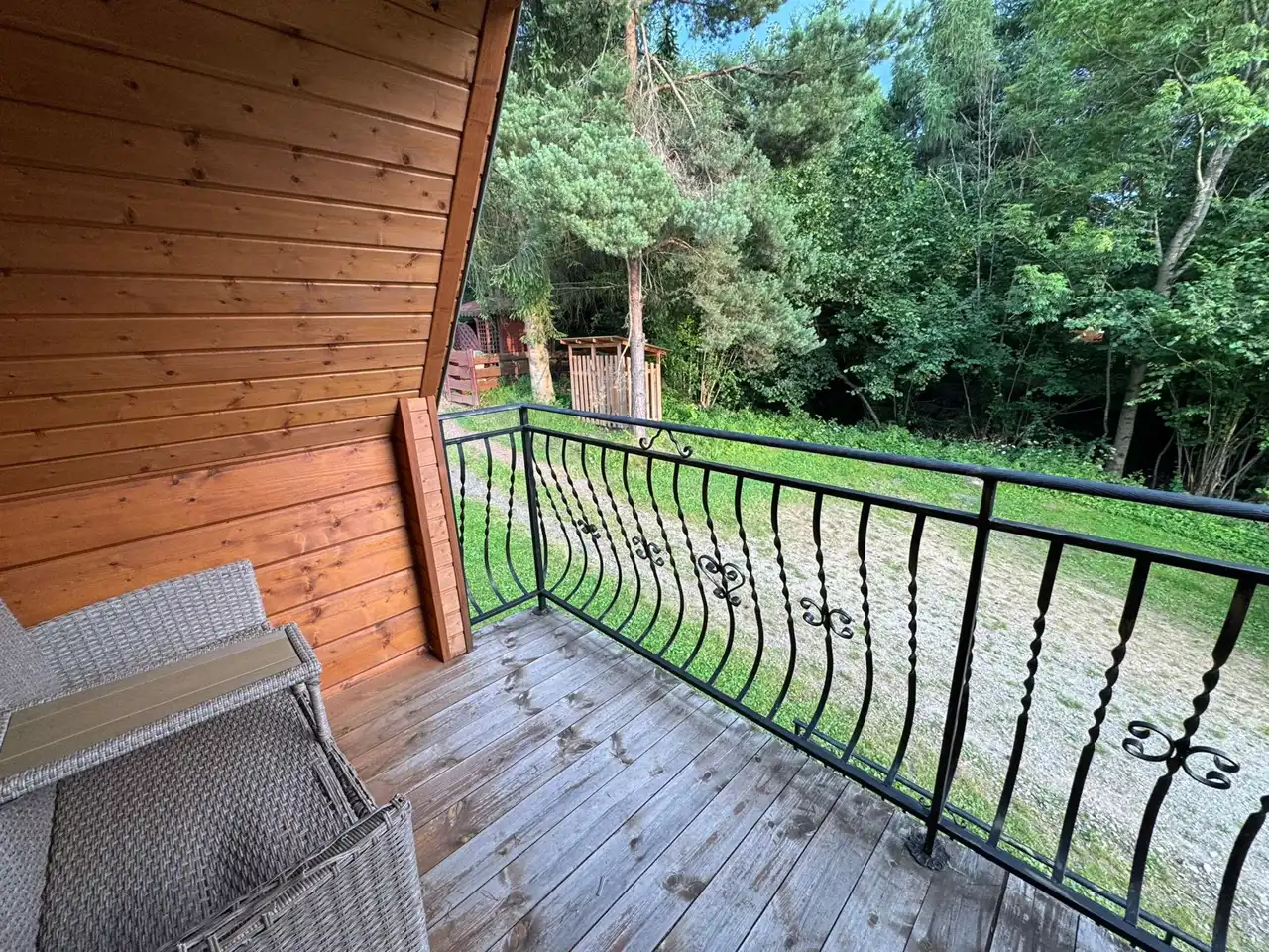 Budynki o konstrukcji drewnianej, wykonana z bali drewnianych, ocieplone od wewnątrz wełną mineralną i wykończone deską oraz docieplone wełną mineralną na zewnątrz i wykończone deską elewacyjną. Podłogi na parterze wykończone są płytkami, na poddaszu wykładziną dywanową. Budynki posiadają taras zewnętrzny z kostką brukową, murowanym grillem oraz balkon z wyjściem z sypialni znajdującej się na poddaszu. Na budynkach zainstalowane zostało oświetlenie zewnętrzne.
