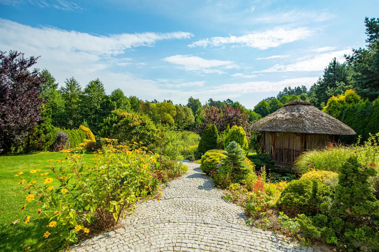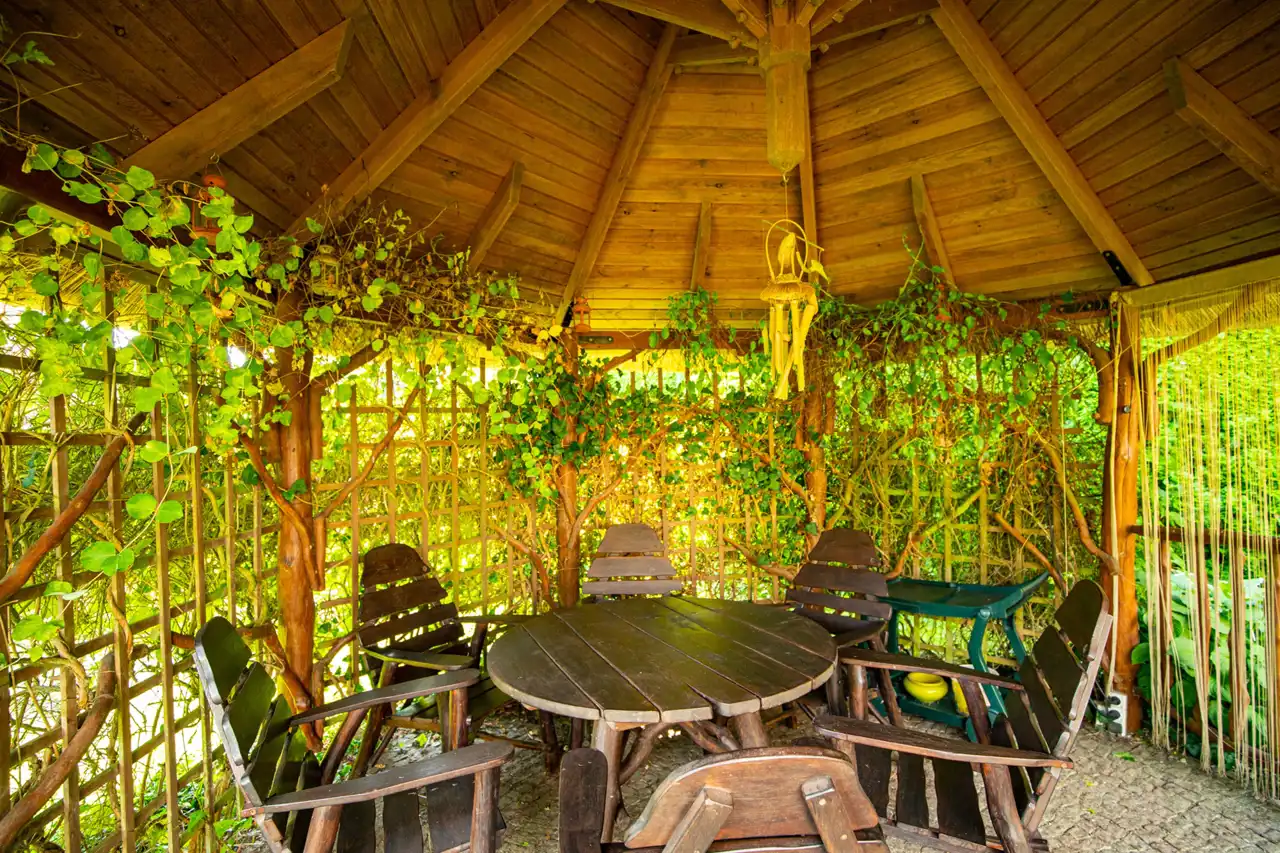 Dla miłośników przebywania lub pracy na świeżym powietrzu postawiona została drewniana altana z sąsiedztwem małego oczka wodnego.