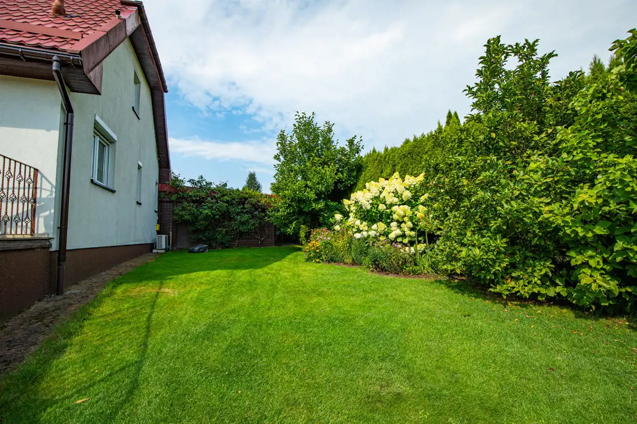 Pięknie zagospodarowana działka z lekko nachylonym ukształtowaniem terenu posiada zadbaną przestrzeń z licznymi nasadzeniami i systemem automatycznego nawadniania ogrodu oraz bezpośredni dostęp do pobliskiego stawu – idealny na relaks i kontakt z naturą.