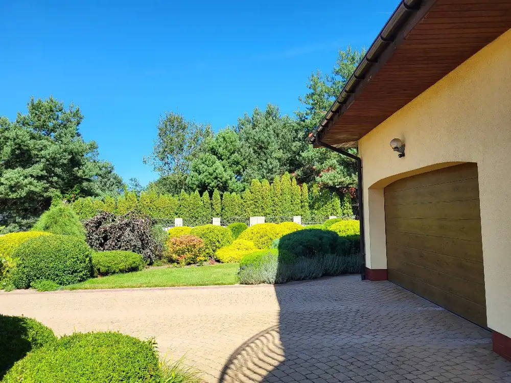 Podjazd pod garaż i ciągi piesze wyłożone kostką semmelrock. Działka jest ogrodzona w systemie mieszanym -murowano-metalowym.