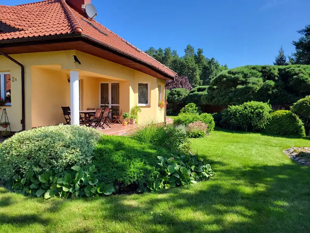 Przepiękny ogród posiada system nawadniania firmy Hunter- bezobsługowy. Na działce znajduje się murowana drewutnia, miejsce na grilla oraz zagroda dla psa. Działka o regularnym kształcie o powierzchni 1374m2 , na której znajdują się liczne nasadzenia: