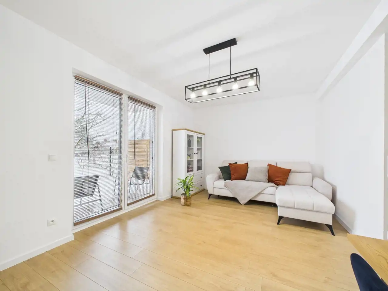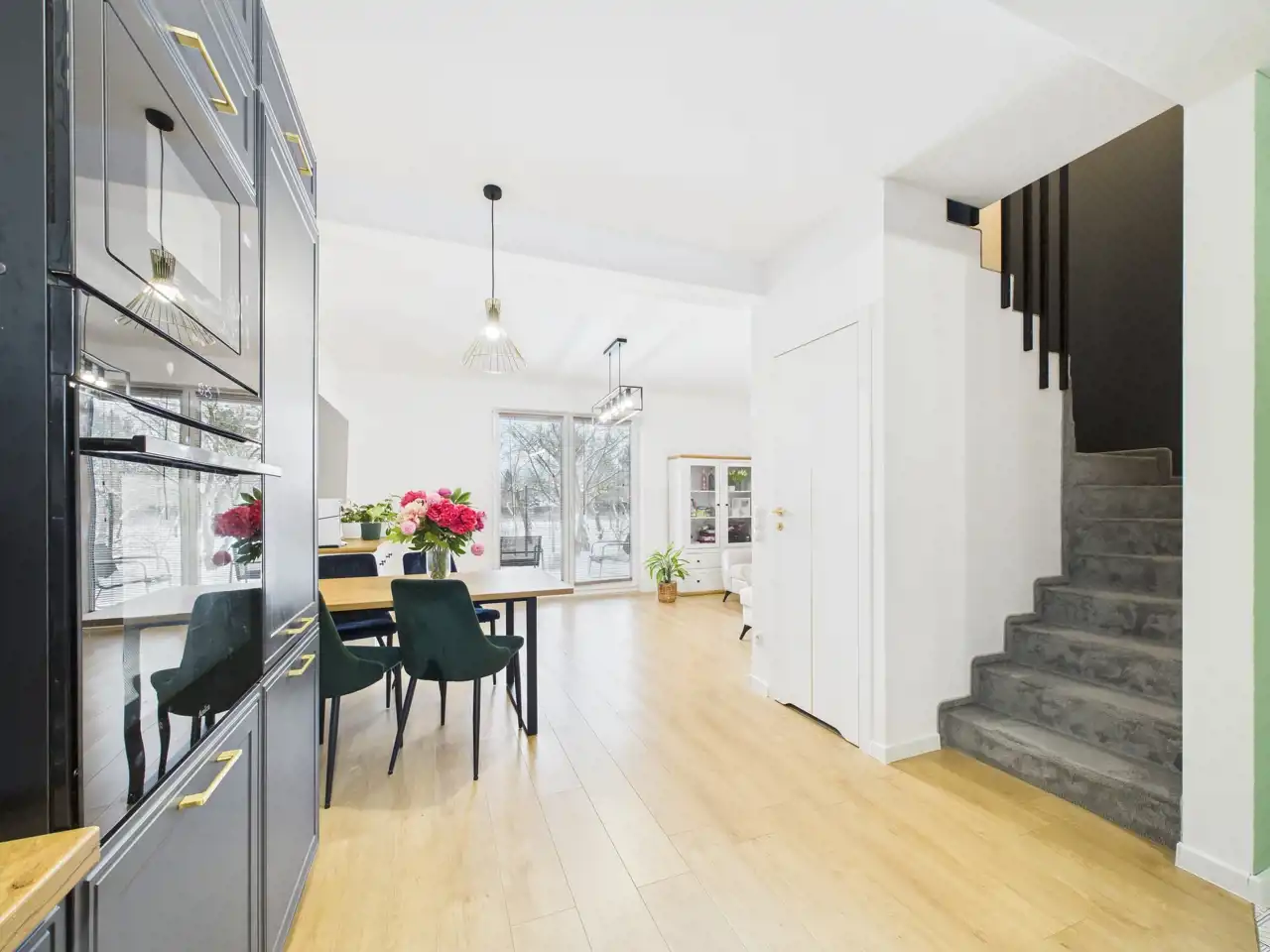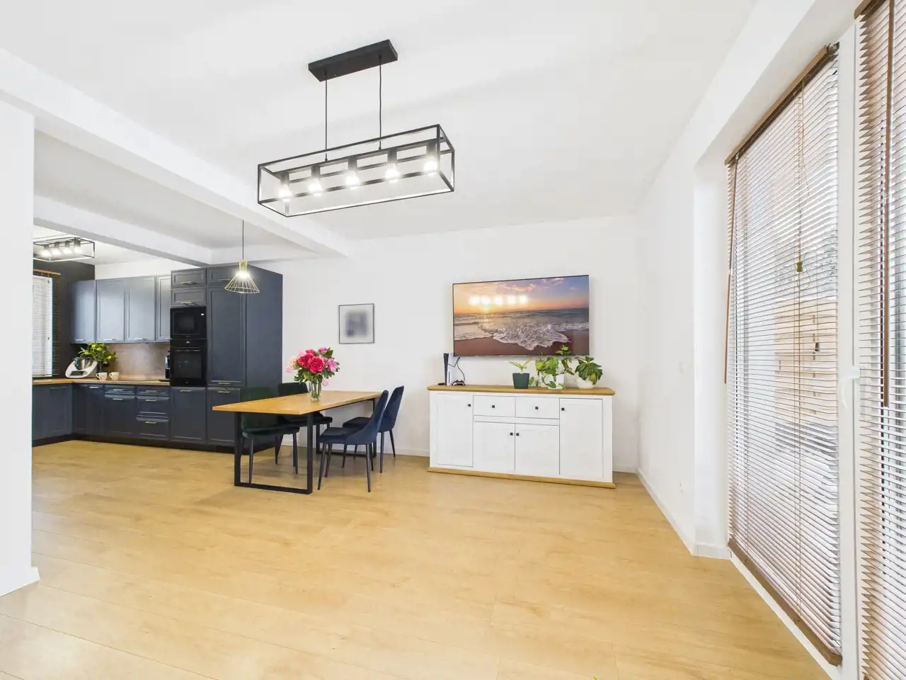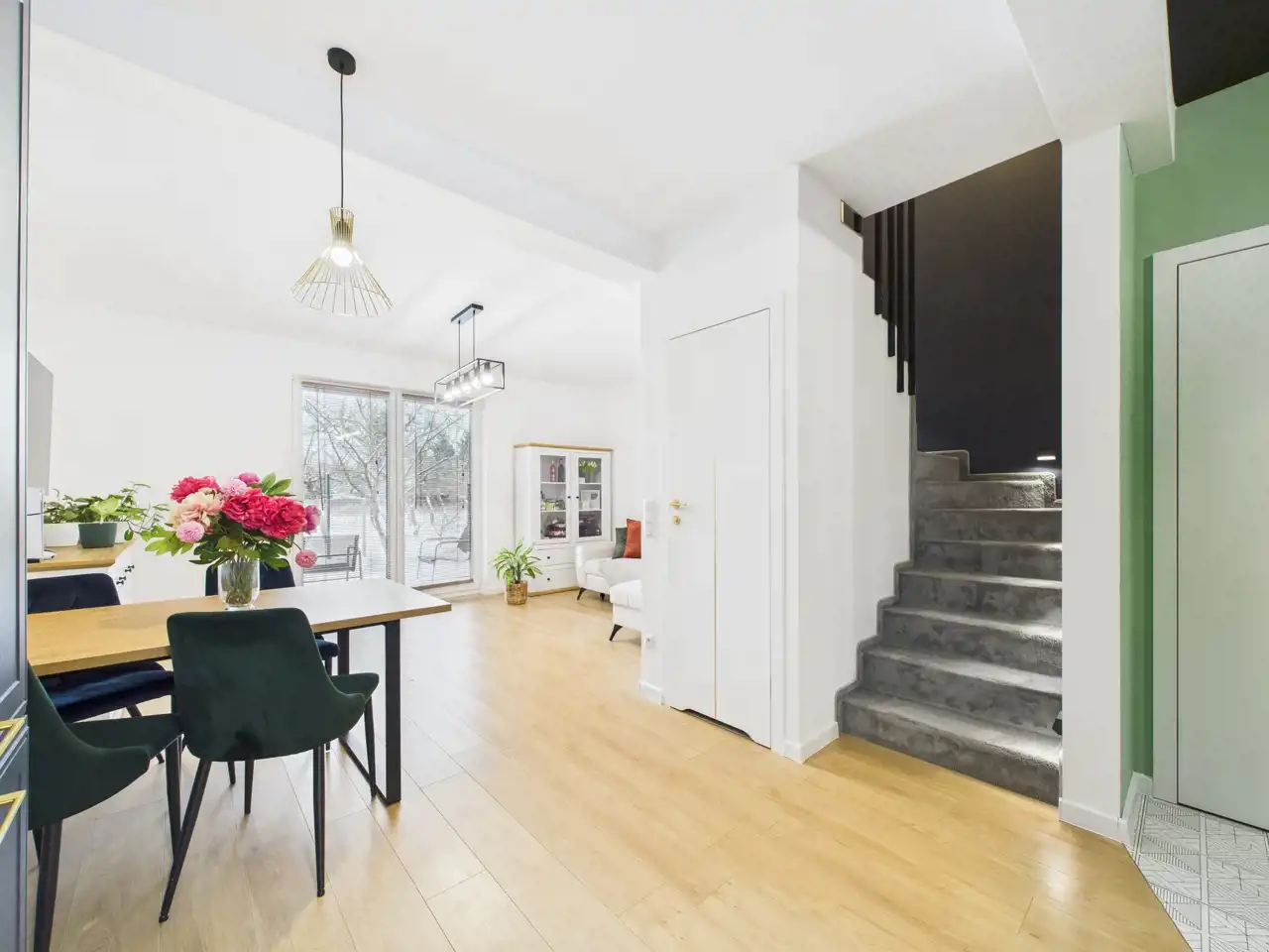 Na parterze znajduje się jasny salon z aneksem kuchennym, który stanowi naturalne centrum życia domowego -idealne miejsce na wspólne posiłki, rodzinne spotkania i codzienny relaks.