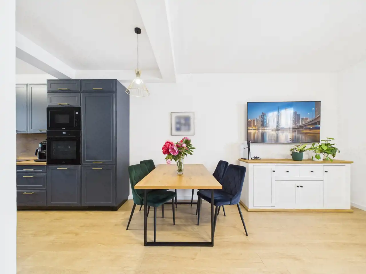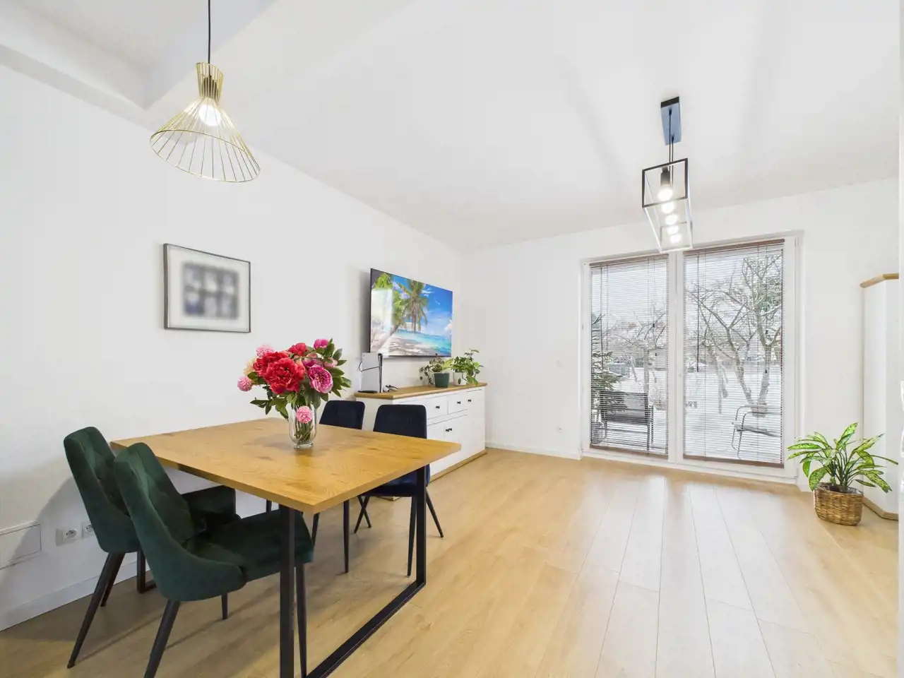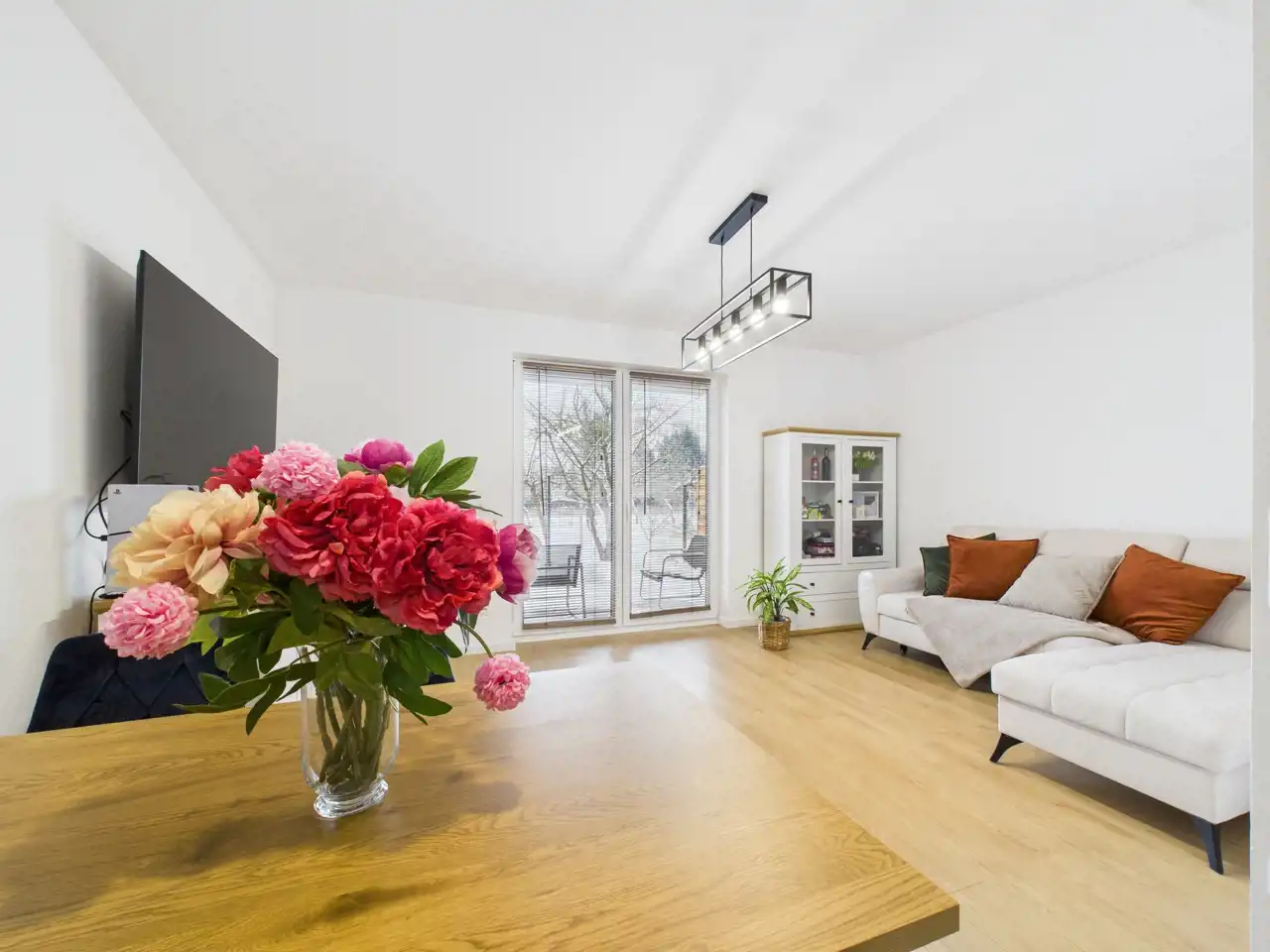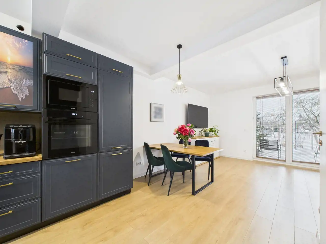 Na parterze znajduje się jasny salon z aneksem kuchennym, który stanowi naturalne centrum życia domowego -idealne miejsce na wspólne posiłki, rodzinne spotkania i codzienny relaks.