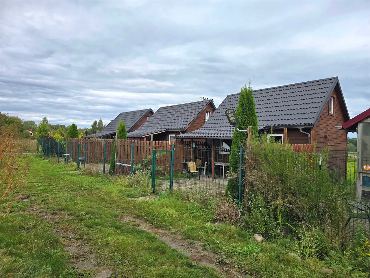 Działka w pełni ogrodzona, z zapewnionymi miejscami parkingowymi oraz prywatnymi ogródkami do każdego z domków