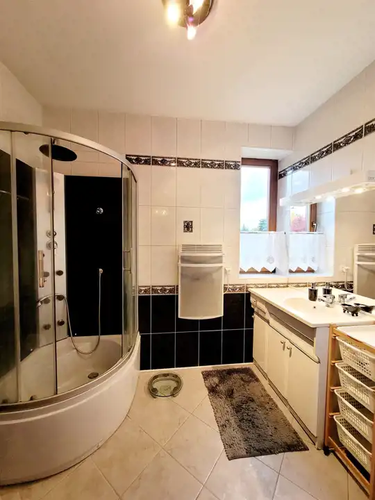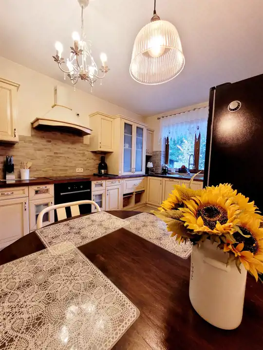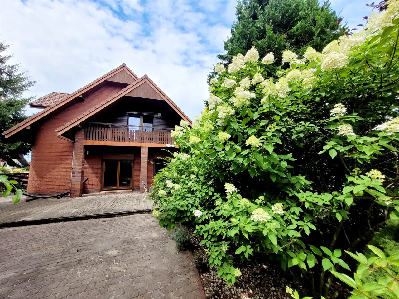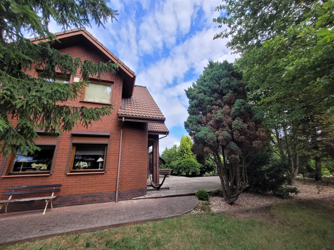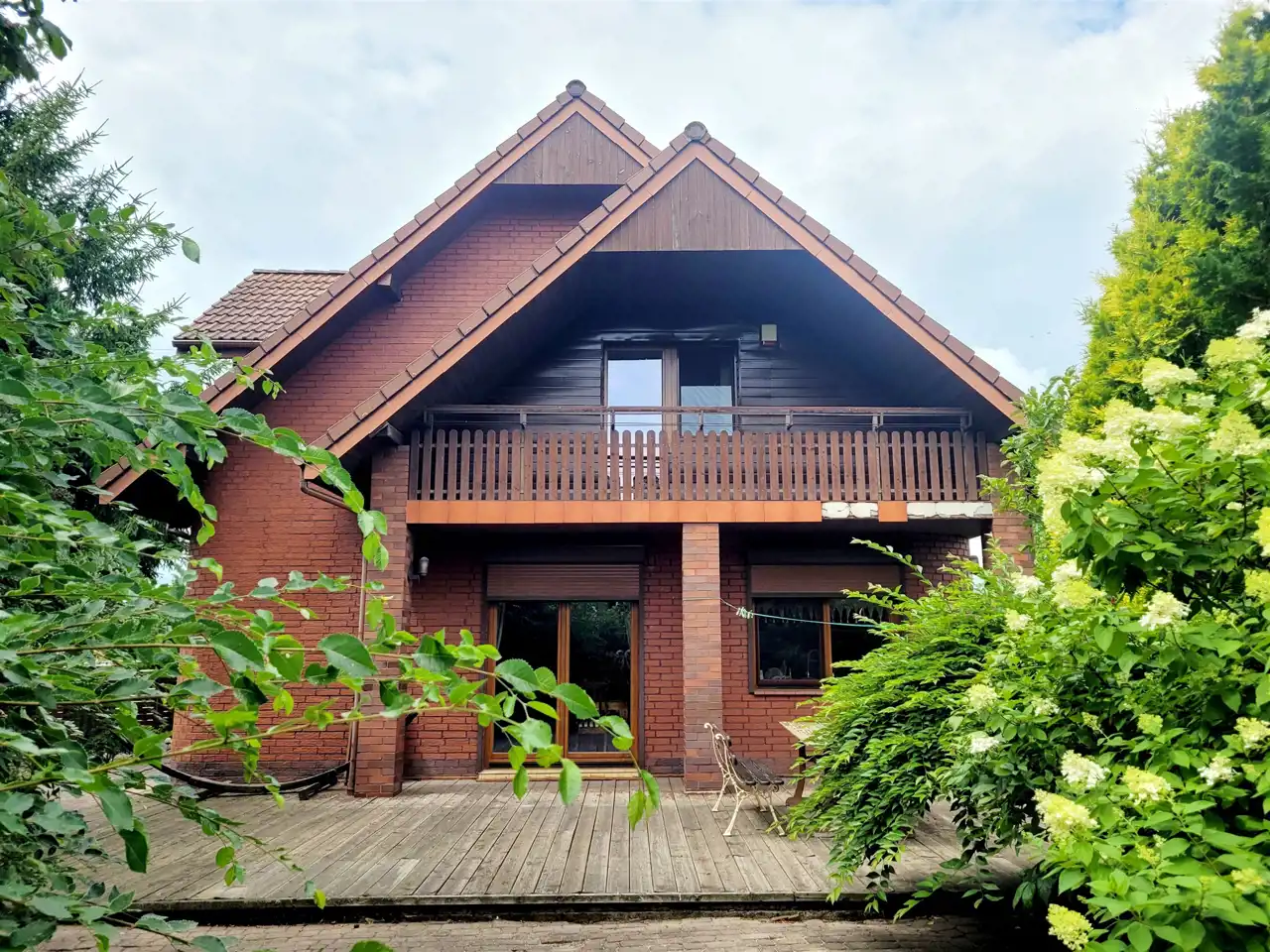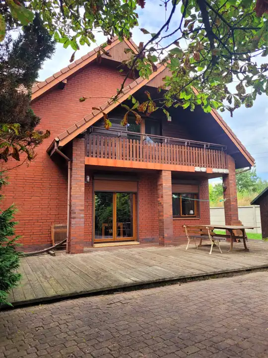 Budynek z 1997roku posadowiony jest na zagospodarowanej i ogrodzonej działce o pow. 993m2. Dom budowany w technologii tradycyjnej - ściany murowane trójwarstwowe 45 cm (cegła gr. 25 cm + izolacja 8cm + cegła pełna klinkierowa o gr. 12 cm). Dach wielospadowy o konstrukcji drewnianej kryty dachówką ceramiczną układaną na kontrłatach. Strop gęstożebrowy. Stolarka okienna PCV. Na podłodze parkiet i płytki, na ścianach gładzie, na parterze pokój dzienny z kominkiem, do dyspozycji duży taras na poziomie parteru oraz na piętrze dwa balkony.