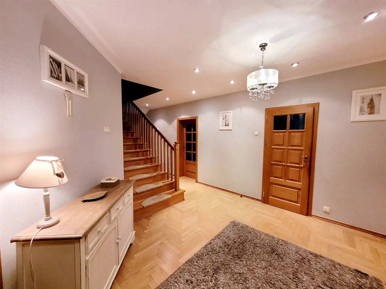 Na piętro prowadzą wygodne, solidne, żelbetowe schody obłożone drewnem.