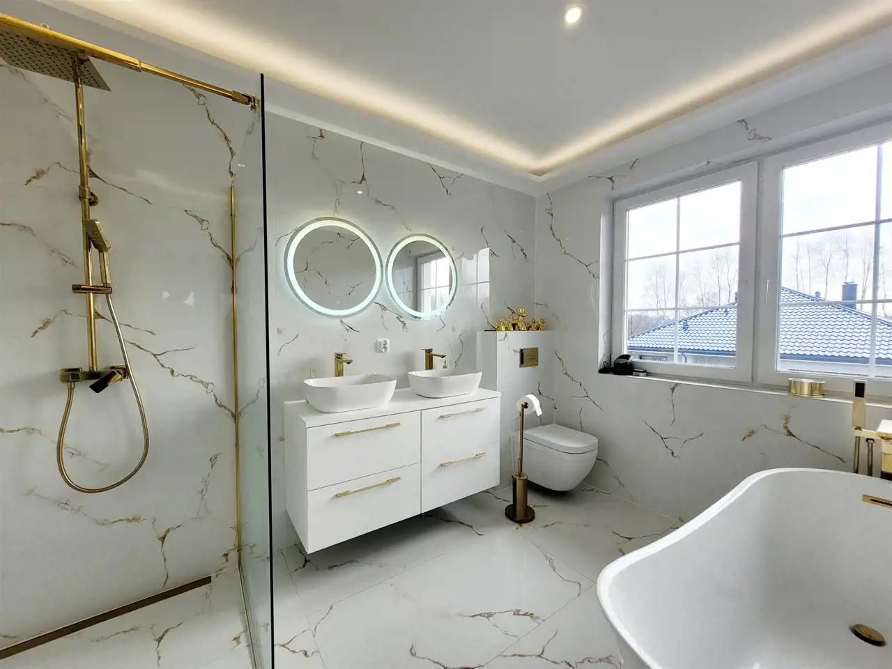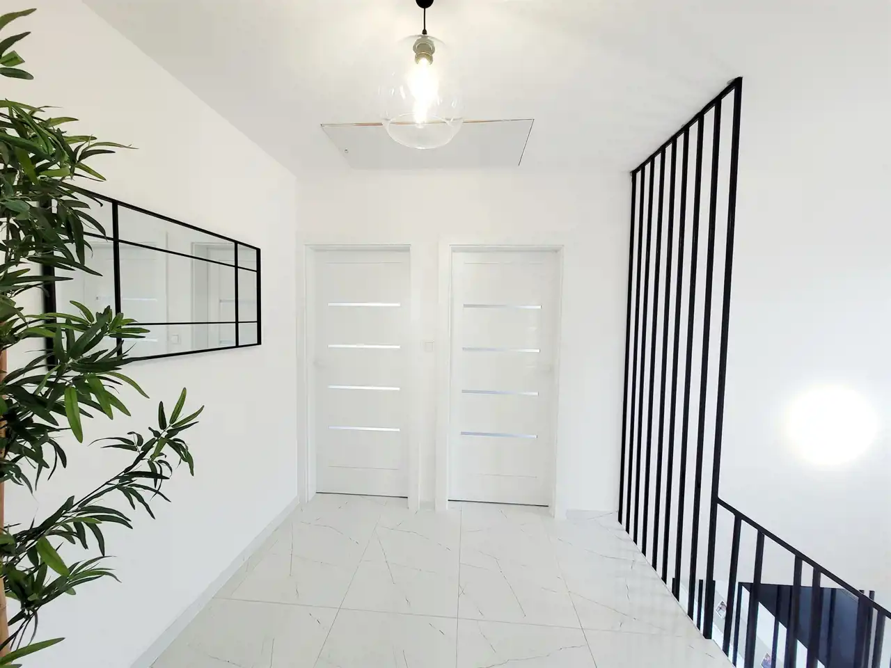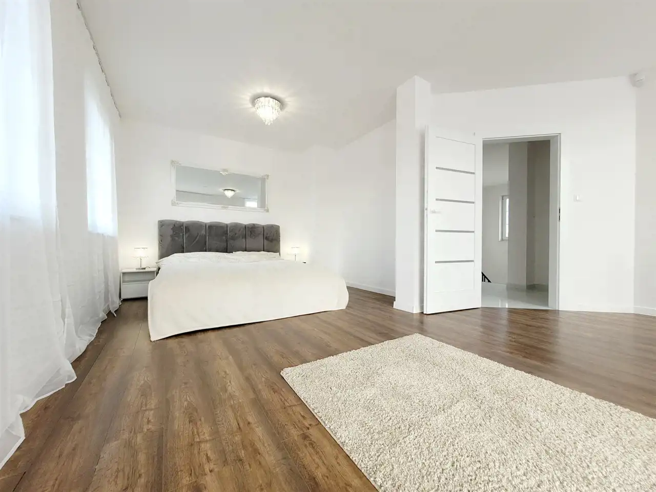 Na parterze mamy jeszcze nowoczesną toaletę, dwustanowiskowy garaż i dużą kotłownię z wyjściem technicznym. Piętro to prywatne królestwo domowników, składa się z trzech sypialni ( jednej z garderobą) oraz ekskluzywnej łazienki z wanną wolnostojącą oraz dużym prysznicem.