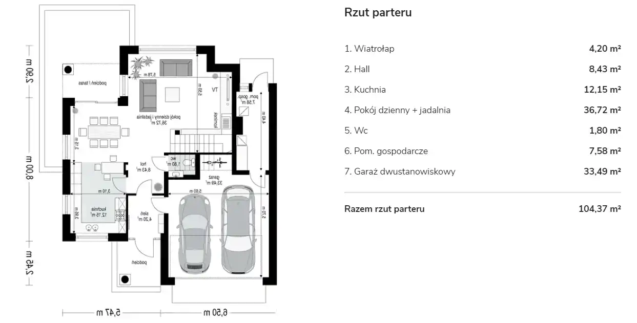 Dom, mimo niewielkiej powierzchni i zwartej bryle jest bardzo funkcjonalny a dużym atutem tego projektu jest podwójny garaż z zamontowaną już bramą elektryczną. Ten dom zauroczy każdego ponadczasową bryłą i pięknym, a jednocześnie praktycznie rozplanowanym wnętrzem.