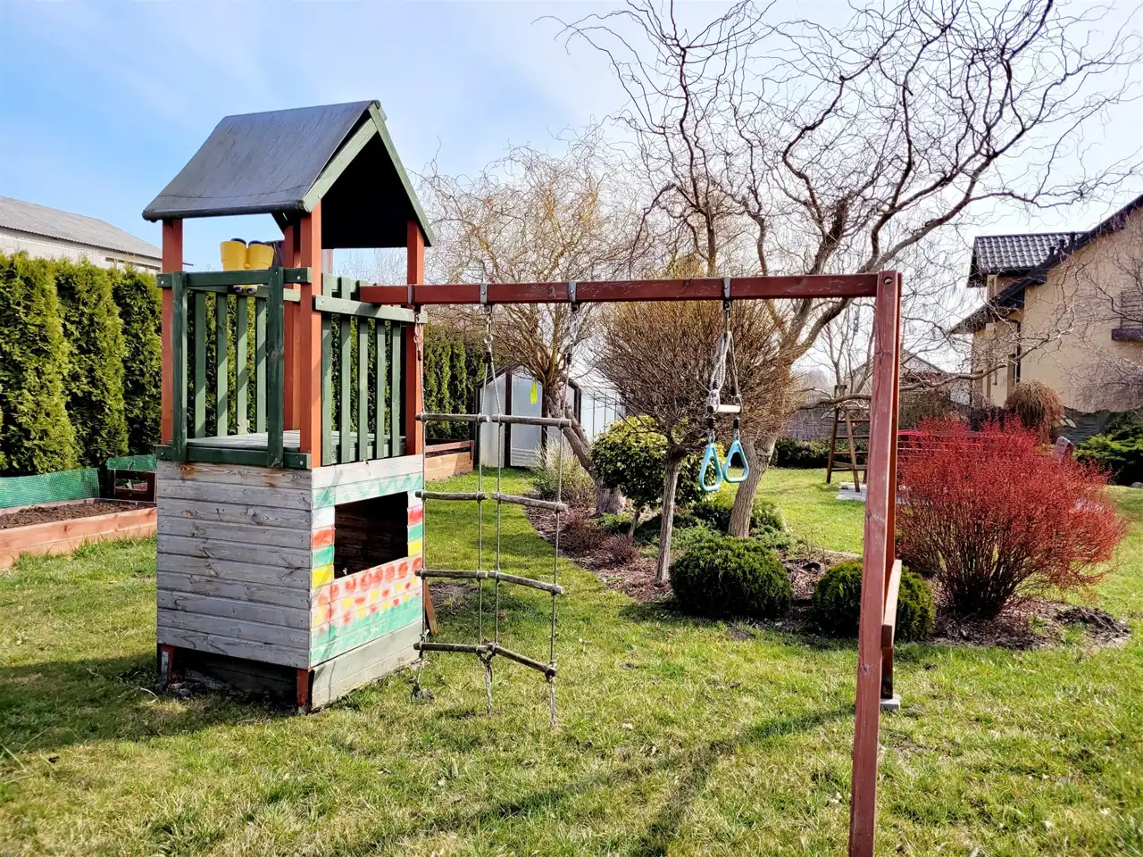 Ogrodzona, ładnie zagospodarowana, liczne nasadzenia i drzewka. Huśtawki ze zjeżdżalnią dla dzieci, stół , miejsce na trampolinę, mała szklarnia, podniesione grządki na domowy warzywnik....nie ma miejsca na nudę! Dodatkowo na działce znajduje się zbiornik na deszczówkę o poj. 300litrów.