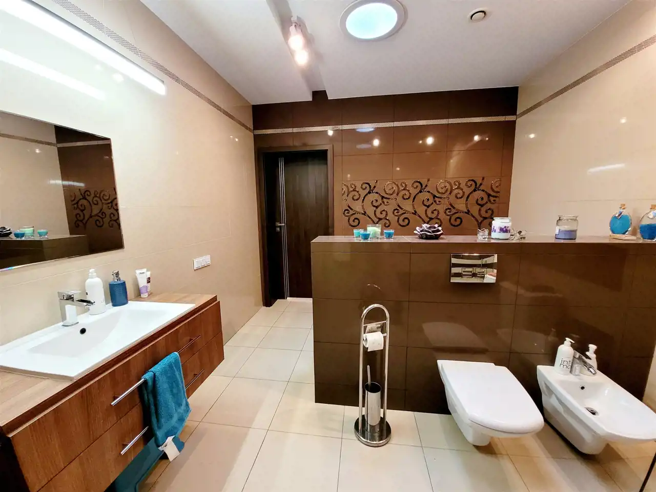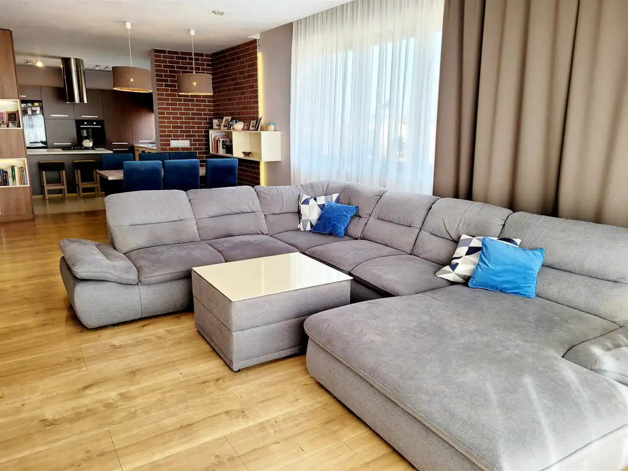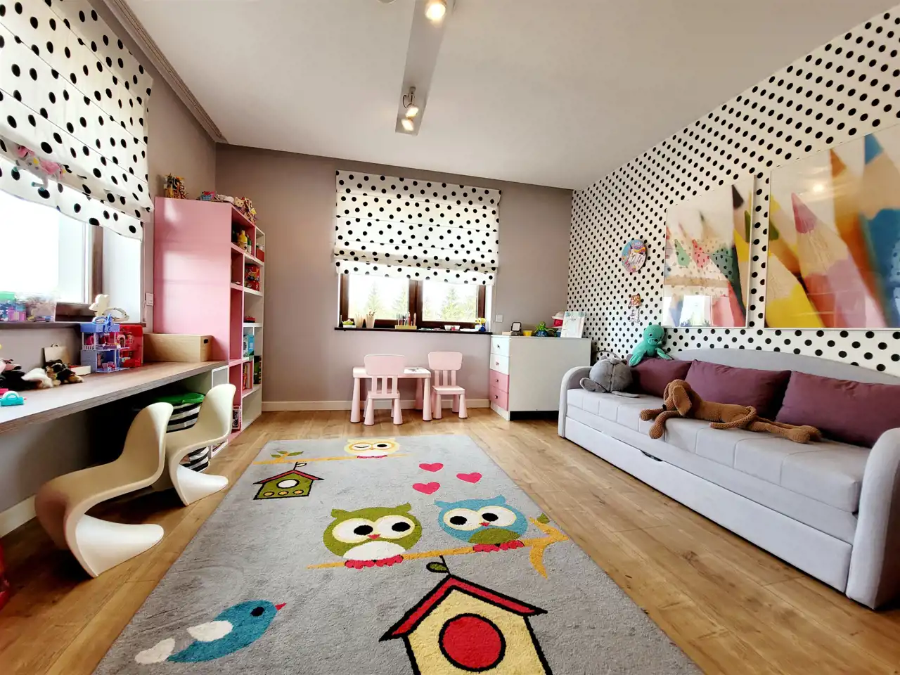 Piętro o powierzchni 170,01m2 zarezerwowane jest dla domowników, to świetnie zaprojektowana strefa dzienna, w której tętni życie rodzinne i towarzyskie. Jest tu widny i przestronny salon z biokominkiem i olbrzymią kanapą- idealne miejsce na jesienne i zimowe wieczory. Przez duże okna w salonie będziesz widzieć swój ogród, a wprost z salonu możesz wyjść na duży taras (ok.30m2). Tu przez cały sezon można biesiadować z liczną grupą znajomych. W drugiej części, po przeciwnej stronie salonu jest jadalnia i kuchnia z pojemną zabudową meblową ( więc nie potrzebujesz dodatkowej spiżarni- będzie więc gdzie schować zapasy). Na tej kondygnacji urządzono główną sypialnię z garderobą i wyjściem na taras; pokój gościnny oraz pokój dla dzieci. Jest też salon kąpielowy z wanną, prysznicem, bidetem, wc i umywalką. Sprytne zastosowanie świetlików dachowych pozwala na oszczędność energii elektrycznej i dodaje uroku. Idealne miejsce na domowe spa.