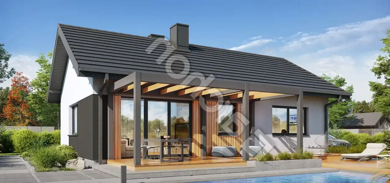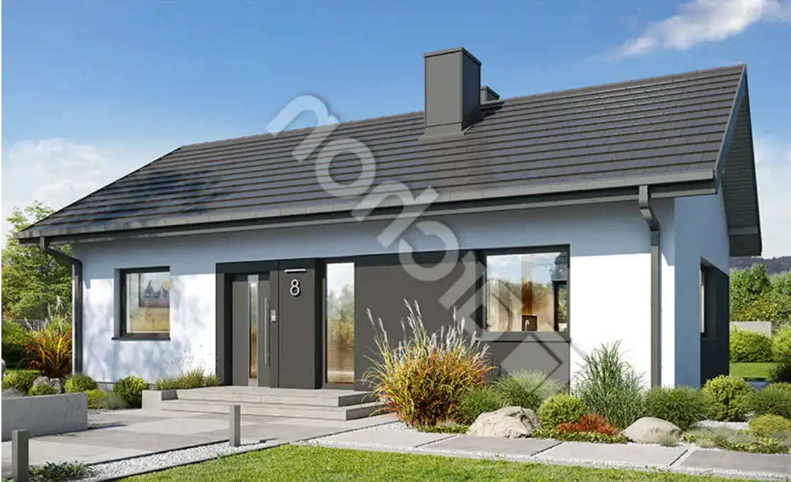 Niezwykle interesujący projekt domu, który wyróżnia się funkcjonalnością parterowego wnętrza oraz atrakcyjną estetyką elewacji. Prosta konstrukcja bryły i dwuspadowy dach umożliwiają jego ekonomiczną realizację. Niewielkie wnętrze domu zostało w optymalny sposób zaprojektowane, w klarowny sposób zdefiniowano strefę dzienną i nocną. Otwarty układ części dziennej, w której domownicy spędzają najwięcej czasu, wizualnie dodaje jej przestronności. Salon zmieści wygodną narożną sofę, a projektowana kuchnia z zabudową posiada odpowiednią ilość powierzchni roboczej oraz do przechowywania. W strefie nocnej mamy do dyspozycji 3 sypialnie, łazienkę, toaletę dla gości. Ponadto w domu znajduje się spore pomieszczenie gospodarcze/kotłownia i wiatrołap z miejscem na pojemną szafę.
