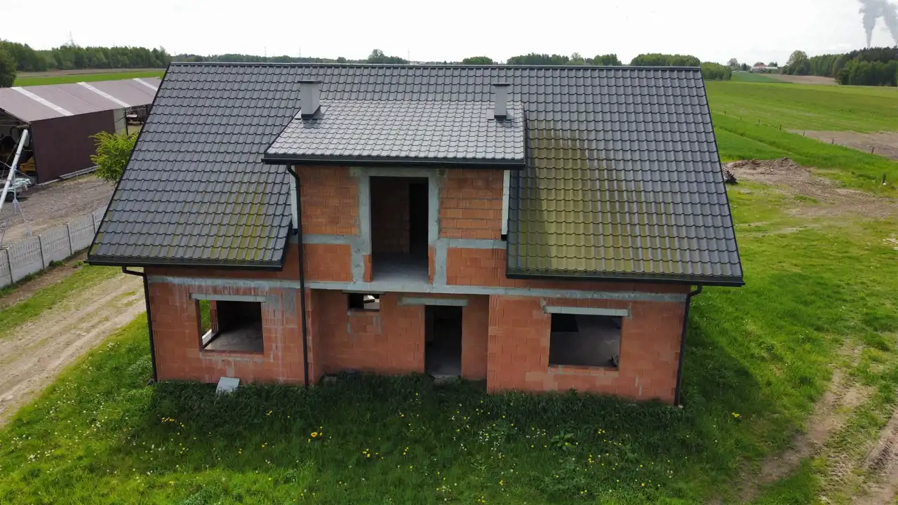 Dom murowany metodą tradycyjną, pustak ceramiczny, na dachu blachodachówka.
