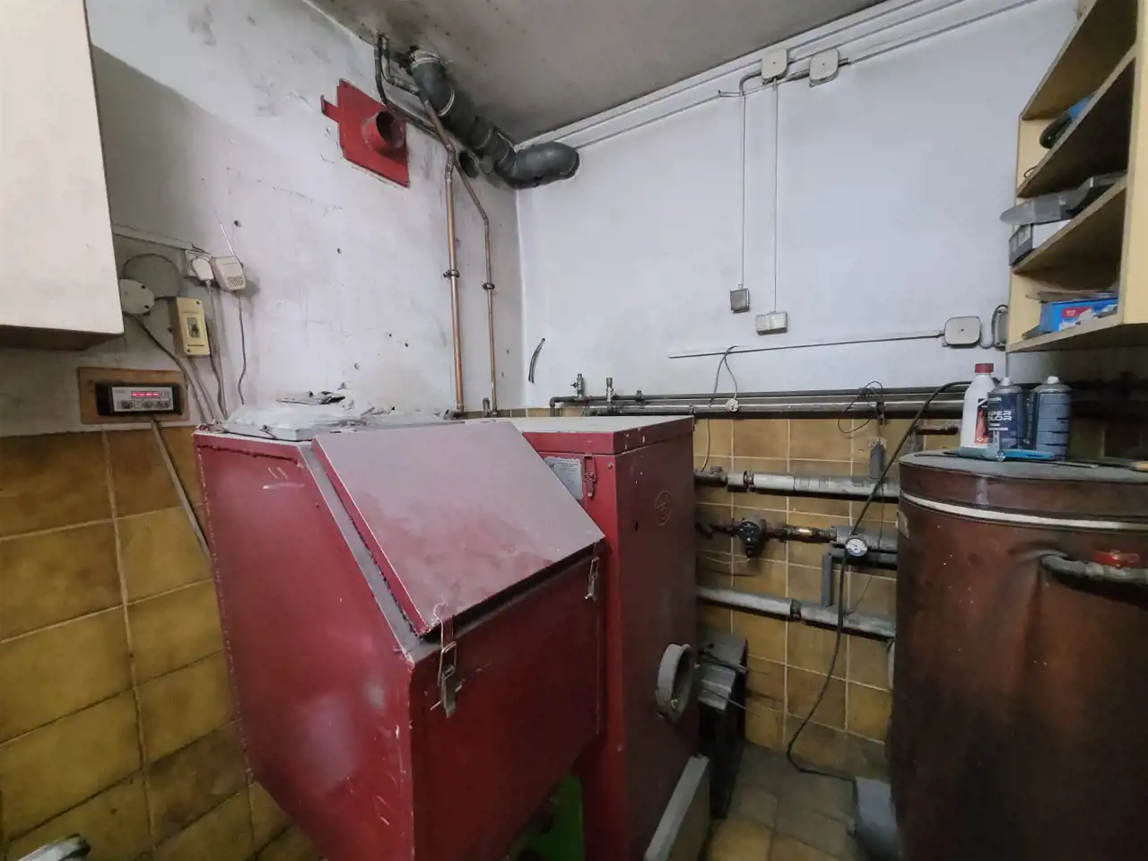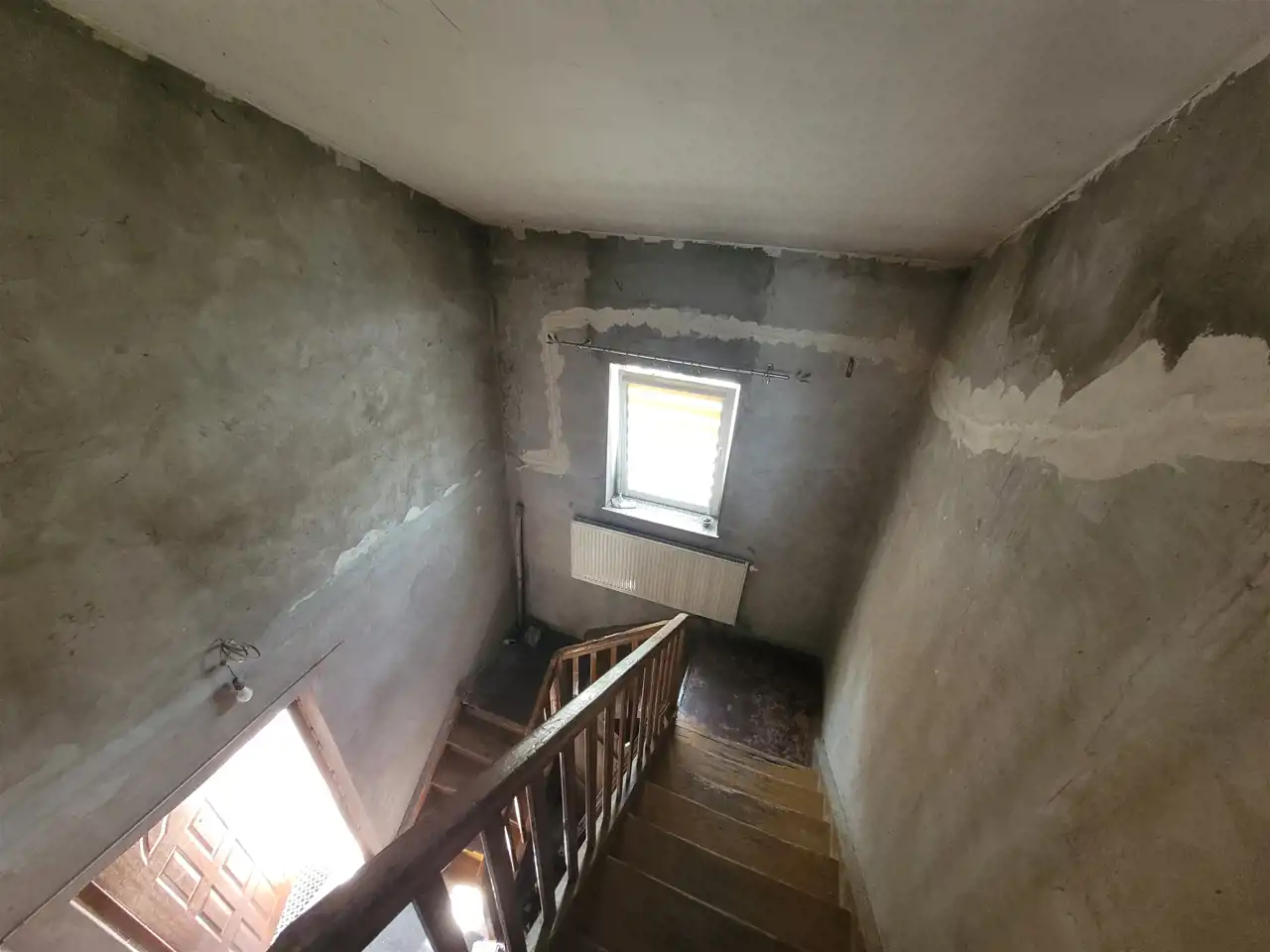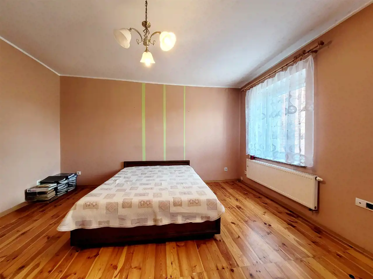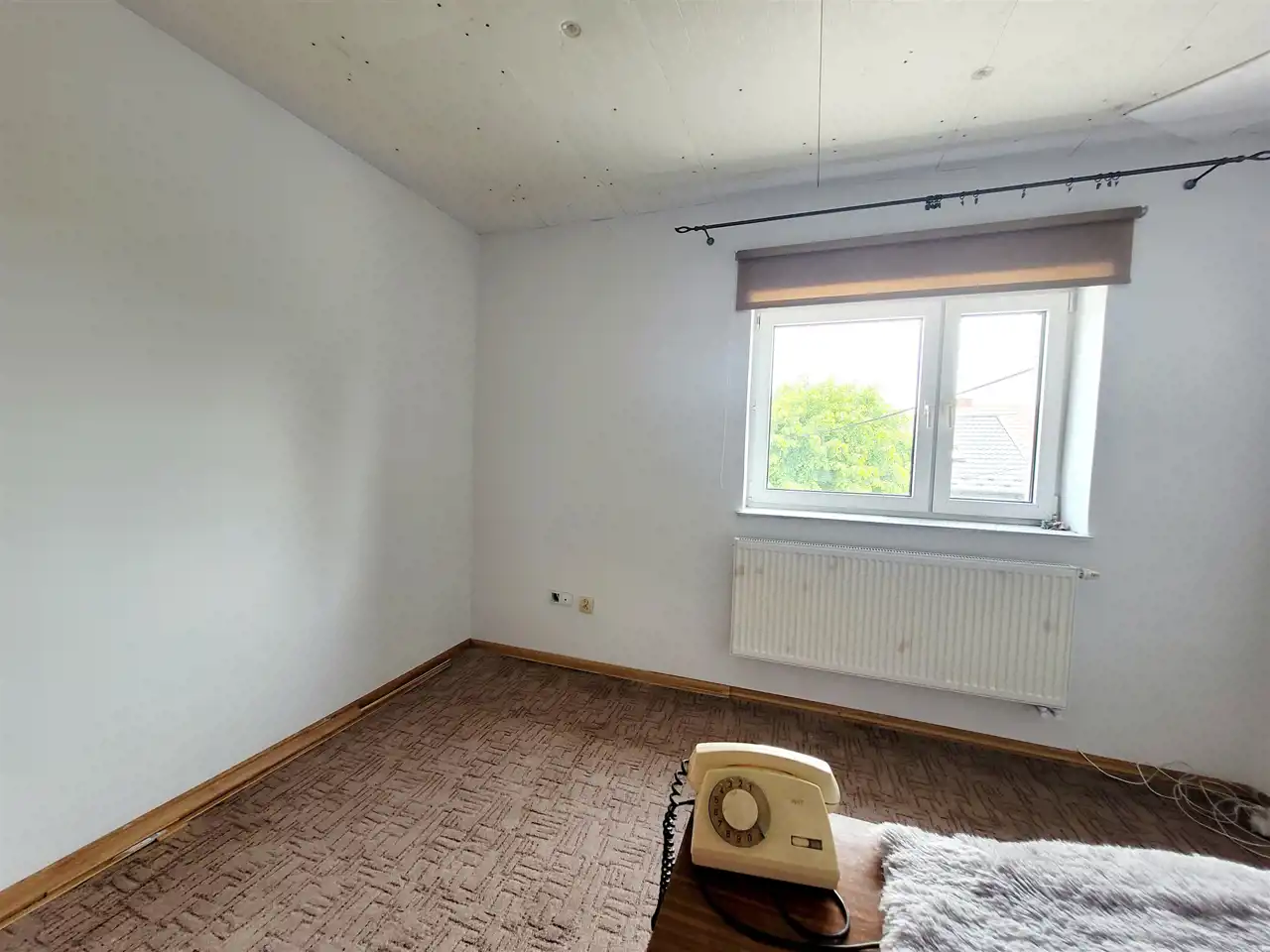 Okna PCV, kaloryfery aluminiowe, na ścianach gładzie/ płyty g-k. Budynek ogrzewany piecem na ekogroszek.
