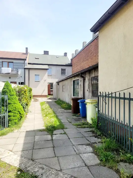 Budynek w zabudowie pierzejowej, przy głównej ulicy.