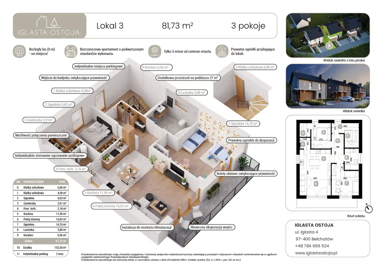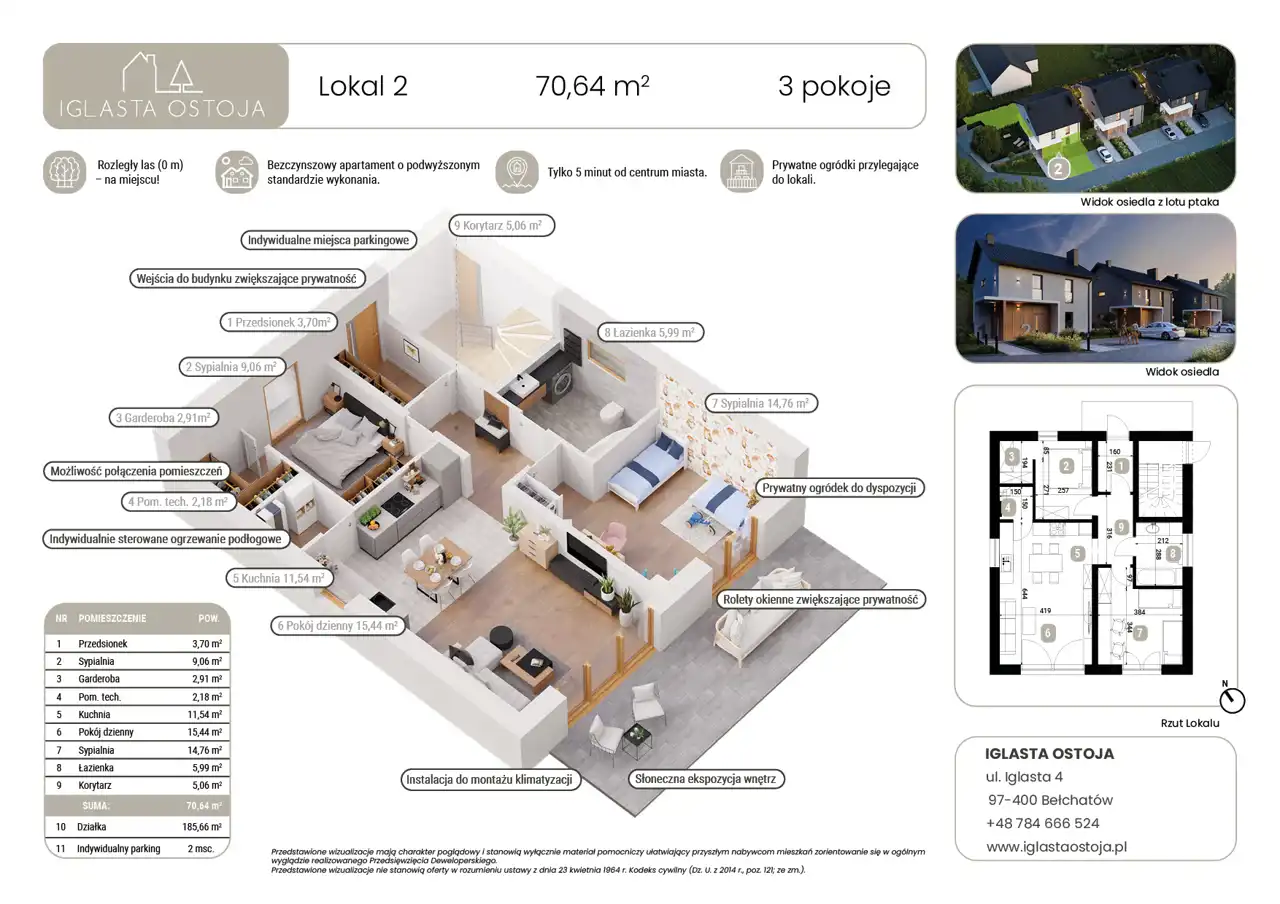 Iglasta Ostoja składa się z 3 budynków, a w nich 6 bezczynszowych apartamentów, zlokalizowanych w bezpośrednim sąsiedztwie terenów leśnych, przy ul. Iglastej w Bełchatowie.