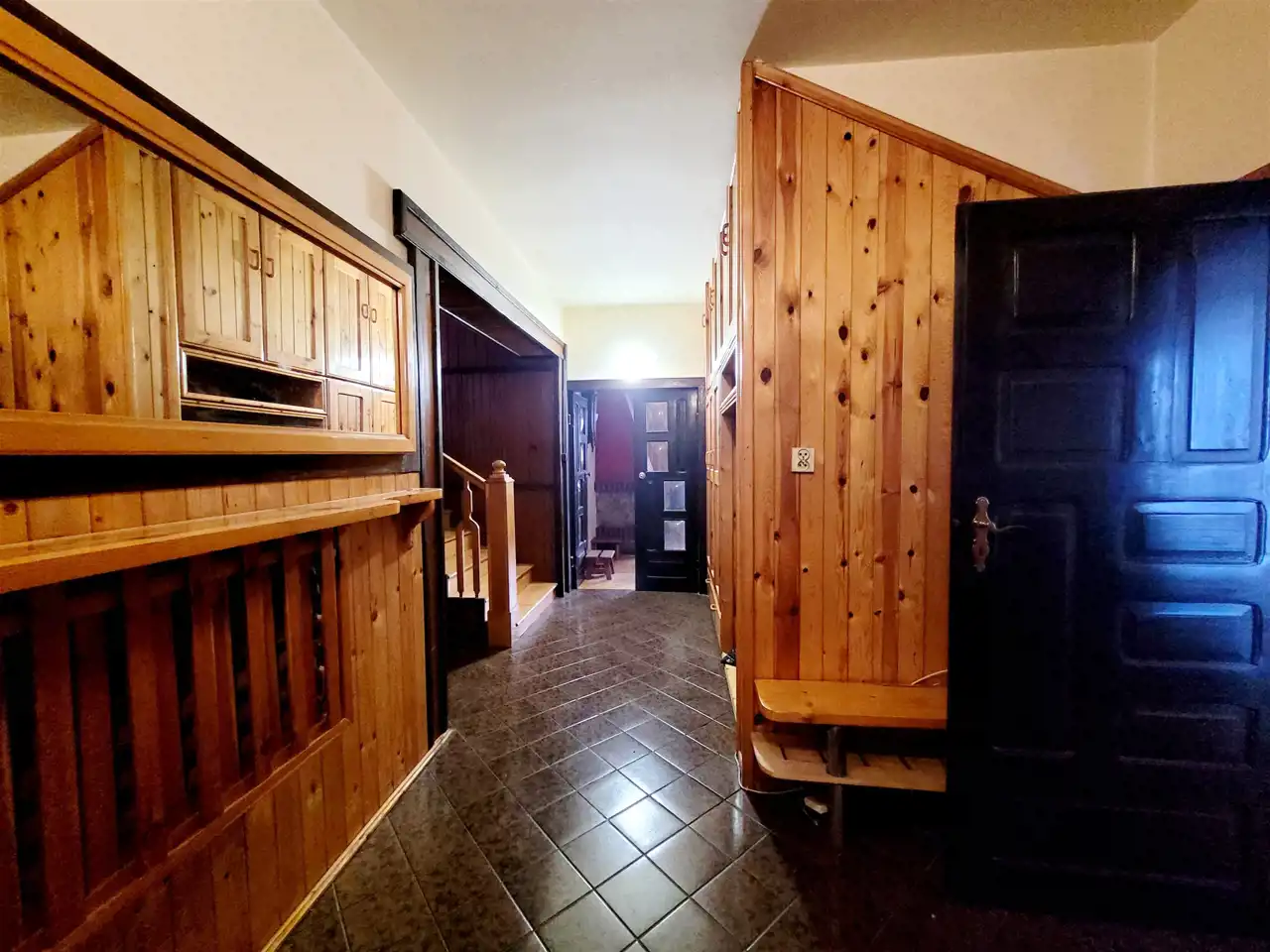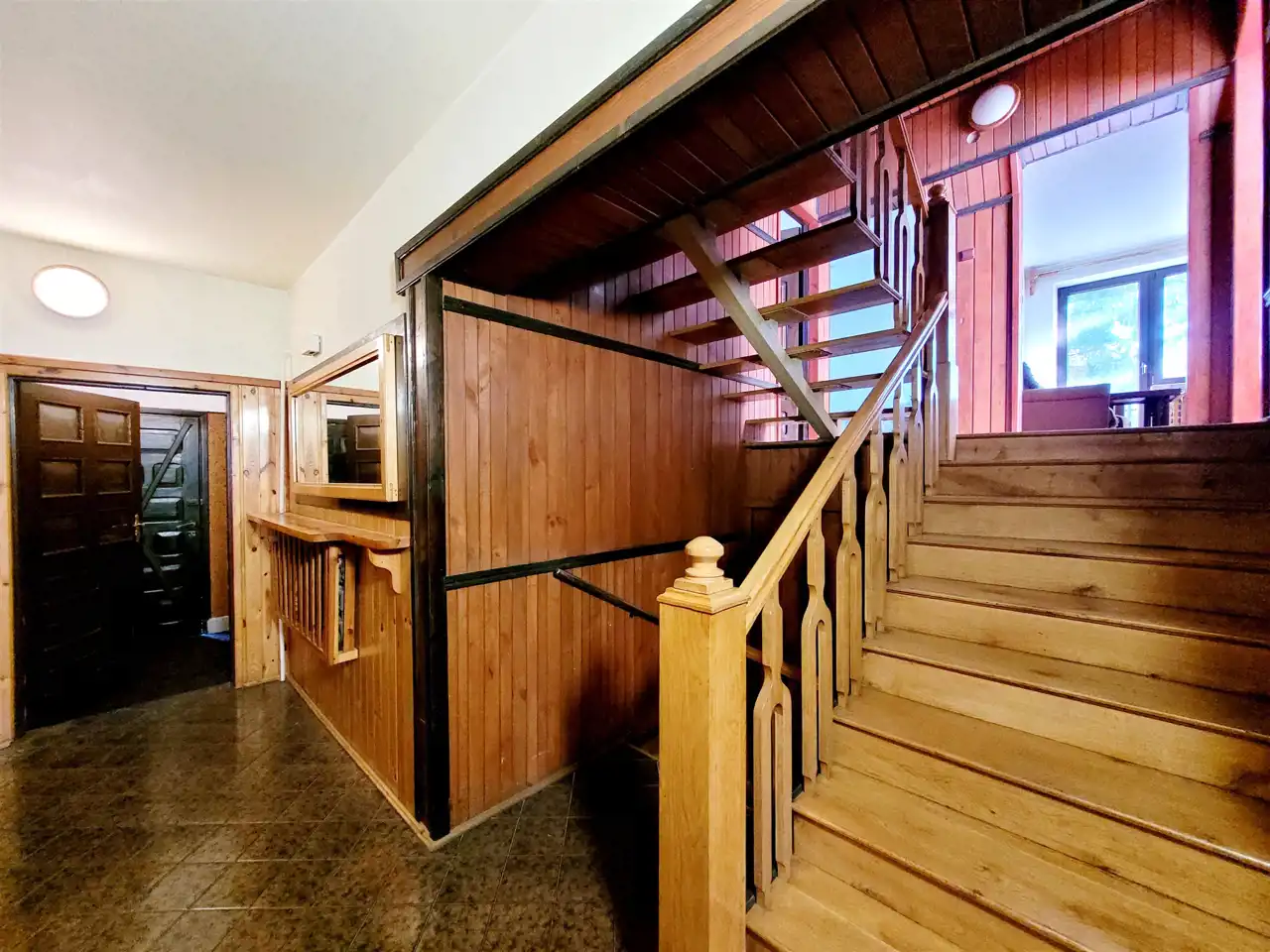 Na każdą kondygnację prowadzą drewniane, ażurowe schody i szeroka klatka schodowa. Stan: do remontu; okna PCV, drewniane podłogi.